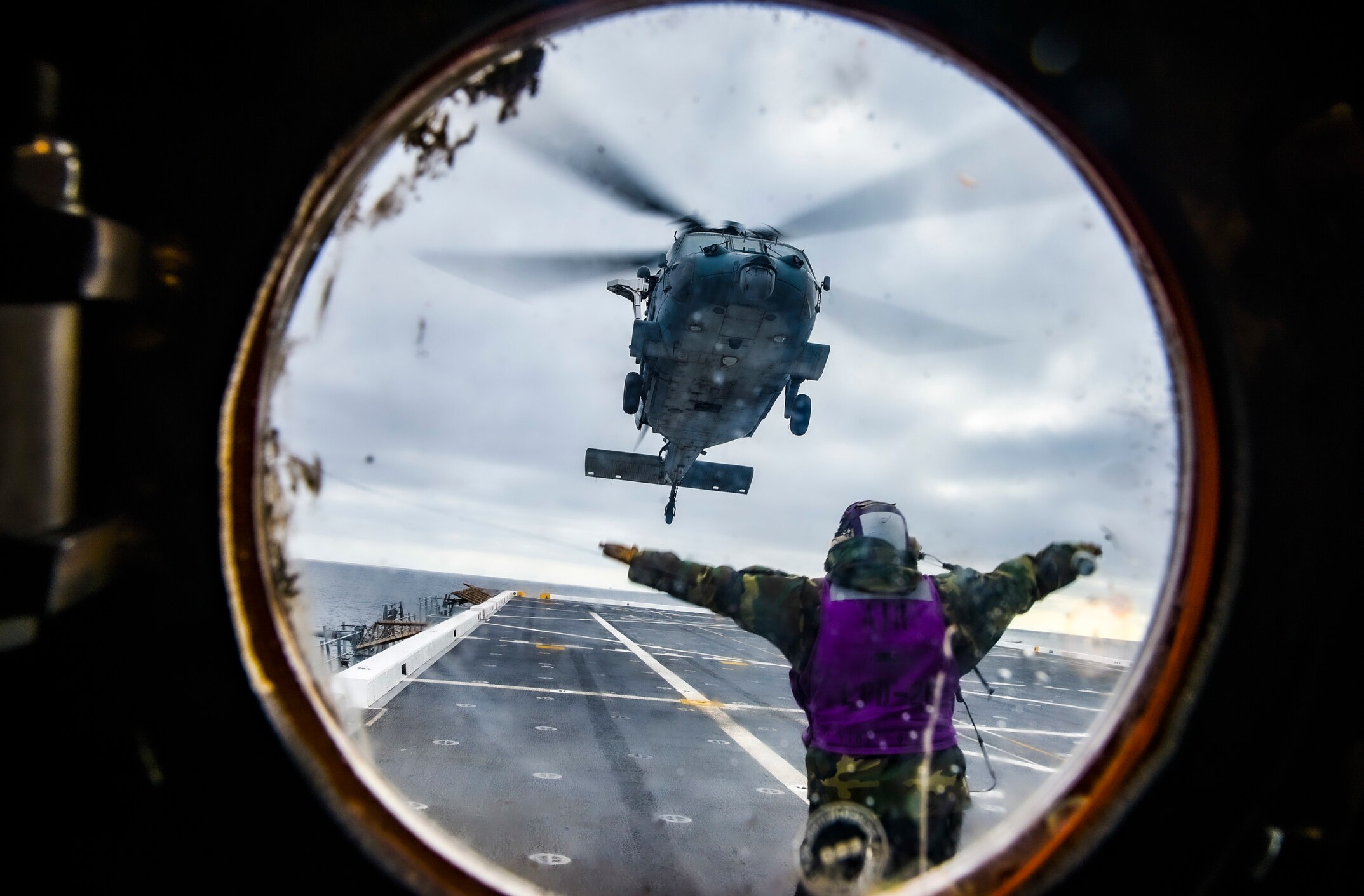 PACIFIC OCEAN (Nov. 2, 2021) Aviation Boatswain’s Mate 3rd Class Tyas Dixon, from Orlando, Fla., assigned to amphibious transport dock ship USS John P. Murtha (LPD 26), directs an MH-60S Seahawk helicopter attached to the “Wild Cards” of Helicopter Sea Combat Squadron (HSC) 23 during flight quarters in support of NASA Underway Recovery Test Nine (URT-9), Nov. 2, 2021. This marks the ninth U.S. Navy underway recovery test in support of the NASA Artemis mission and the third time a URT has taken place aboard John P. Murtha. The U.S. Navy has many unique capabilities that make it an ideal partner for supporting NASA, including its amphibious capabilities with the ability to embark helicopters, launch and recover small boats, three-dimensional air search radar, and advanced medical facilities. (U.S. Navy photo by Mass Communication Specialist 2nd Class Curtis D. Spencer)