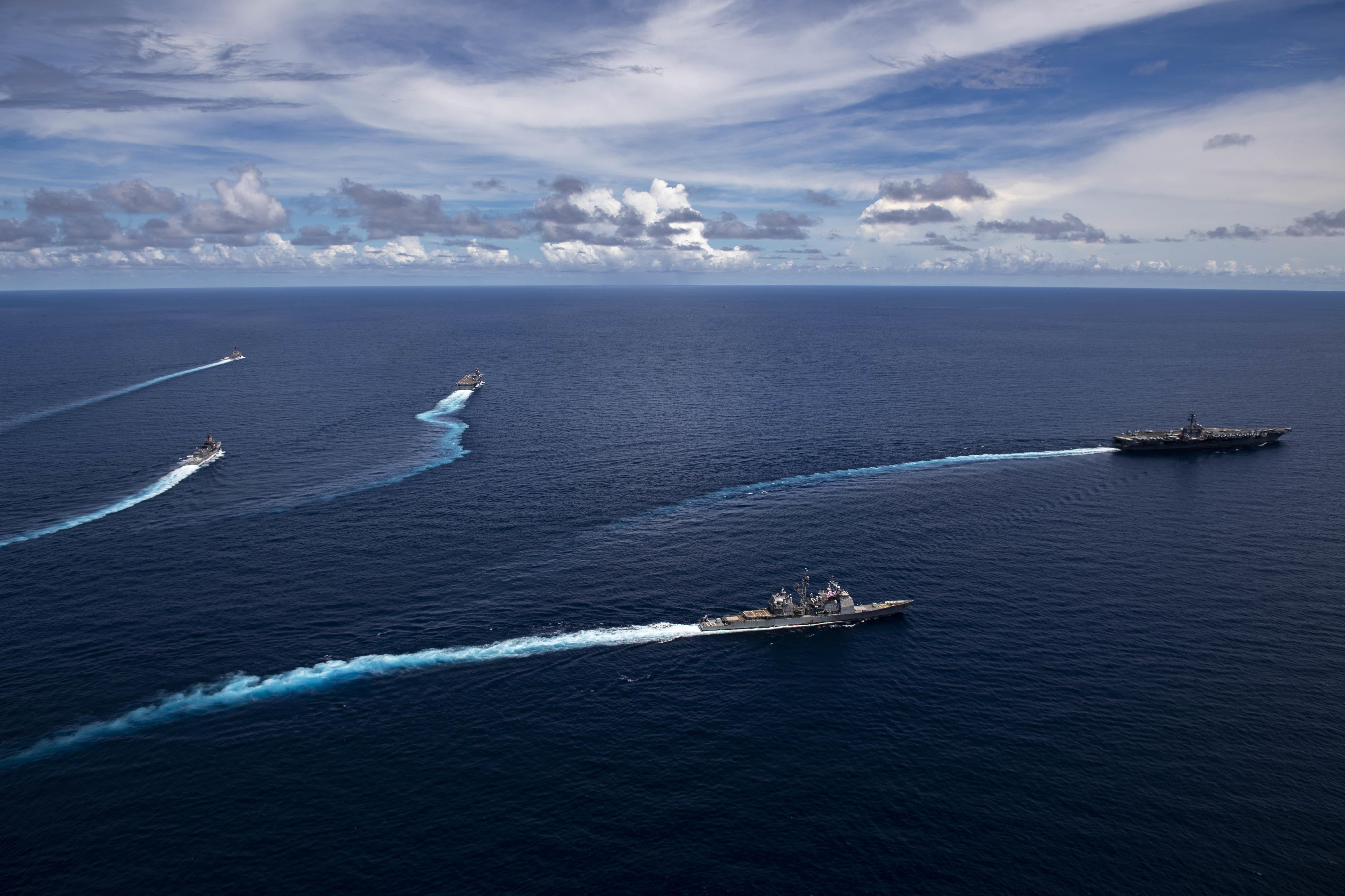 SOUTH CHINA SEA (Oct. 30, 2021) U.S. Navy Ticonderoga-class guided-missile cruiser USS Shiloh (CG 67), U.S. Navy Ticonderoga-class guided-missile cruiser USS Lake Champlain (CG 57), U.S. Navy Nimitz-class aircraft carrier USS Carl Vinson (CVN 70), U.S. Navy Arleigh Burke-class guided-missile destroyer USS Milius (DDG 69), Japan Maritime Self-Defense Force (JMSDF) Murasame-class destroyer JS Murasame (DD 101), and JMSDF Izumo-class helicopter destroyer JS Kaga (DDH 184) transit together in the South China Sea, Oct. 30, 2021. Elements of U.S. Navy Carrier Strike Group (CSG) 1 and JMSDF are conducting bilateral operations in the South China Sea. (U.S. Navy photo by Mass Communication Specialist 2nd Class Haydn N. Smith)