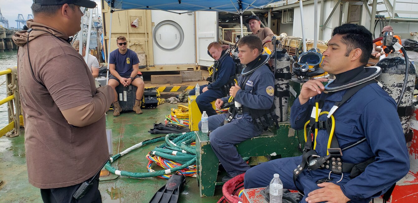 PANAMA CITY (Nov. 7, 2021) Chief Navy Diver Jesse Delapena, assigned to Mobile Diving and Salvage Unit (MDSU) 2, conducts a dive brief before divers enter the water to conduct a survey of the pier floor to validate separation of wreckage, Nov. 7, 2021. Sailors from MDSU 2 and personnel from the Navy's Supervisor of Salvage and Diving (SUPSALV) are conducting a salvage operation to remove a sunken vessel which has blocked Pier 3 of the Vasco Nunez de Balboa port in Panama since 2004. U.S. Naval Forces Southern Command/U.S. 4th Fleet serves as a trusted partner for Caribbean, Central and South America maritime forces leading to improved unity, security and stability. (U.S. Navy photo by Chief Mass Communication Specialist Kathleen Gorby)