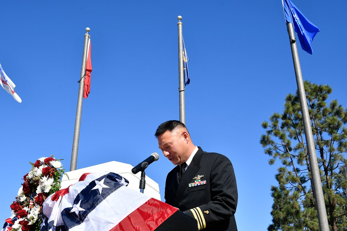 VENTURA COUNTY, Calif. (Nov. 11, 2021) Lt. Cmdr. Yoon Choi, chaplan, Naval Base Ventura County (NBVC), conducts invocation during a Veterans Day Ceremony at Ventura County Veterans Memorial Nov. 11, 2021. NBVC is home to Point Mugu, Port Hueneme, San Nicolas Island, Laguna Peak, the Pacific Coast Seabees, the Westcoast Hawkeyes, 3 warfare centers, and 80 tenants. It is the largest employer in Ventura County and actively protects California’s largest coastal wetlands through its award-winning environmental programs. (U.S. Navy photo by Ensign Drew Verbis)