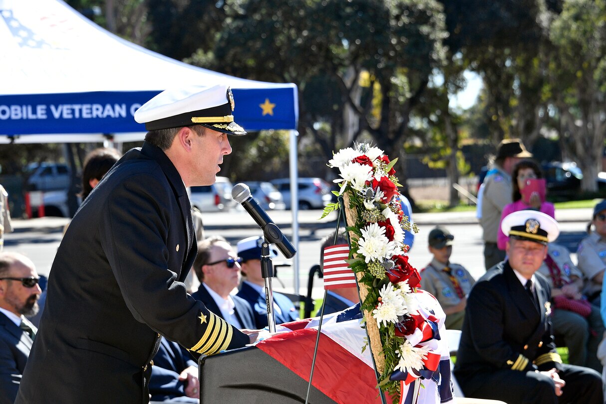 VENTURA COUNTY, Calif. (Nov. 11, 2021) Capt. Robert "Barr" Kimnach III, commanding officer, Naval Base Ventura County (NBVC), delivers remarks during a Veterans Day Ceremony at Ventura County Veterans Memorial Nov. 11, 2021. NBVC is home to Point Mugu, Port Hueneme, San Nicolas Island, Laguna Peak, the Pacific Coast Seabees, the Westcoast Hawkeyes, 3 warfare centers, and 80 tenants. It is the largest employer in Ventura County and actively protects California’s largest coastal wetlands through its award-winning environmental programs. (U.S. Navy photo by Ensign Drew Verbis)