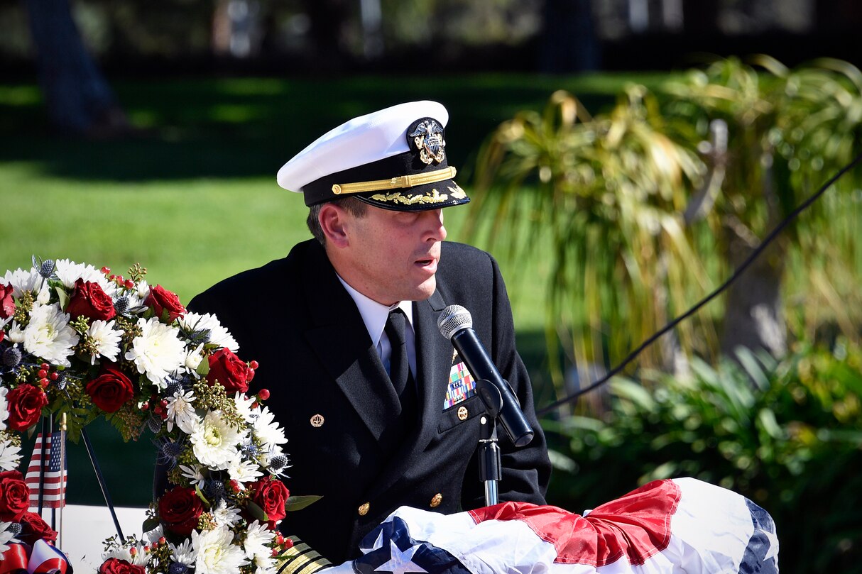 VENTURA COUNTY, Calif. (Nov. 11, 2021) Capt. Robert "Barr" Kimnach III, commanding officer, Naval Base Ventura County (NBVC), delivers remarks during a Veterans Day Ceremony at Ventura County Veterans Memorial Nov. 11, 2021. NBVC is home to Point Mugu, Port Hueneme, San Nicolas Island, Laguna Peak, the Pacific Coast Seabees, the Westcoast Hawkeyes, 3 warfare centers, and 80 tenants. It is the largest employer in Ventura County and actively protects California’s largest coastal wetlands through its award-winning environmental programs. (U.S. Navy photo by Ensign Drew Verbis)