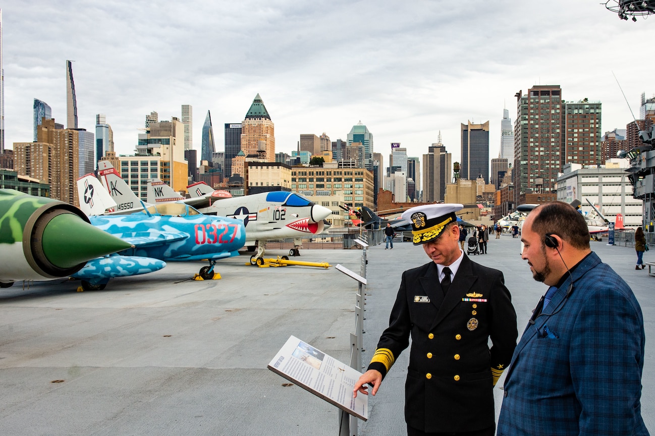 NEW YORK (Nov. 11, 2021) Vice Adm. John Mustin, Chief of Navy Reserve, tours the Intrepid Sea, Air & Space Museum with Intrepid tour guide David Padilla prior to the Intrepid Veterans Day Ceremony. Veterans Day honors our nation’s veterans for their service and sacrifice. (U.S. Navy photo by Mass Communication Specialist 3rd Class Xiaoming Zheng)