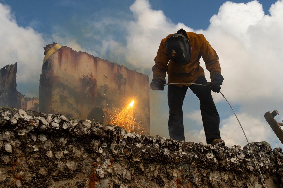 SANTA RITA, Guam (Nov. 10, 2021) Navy Diver 2nd Class Kolby Konopacky, from Stevens Point, Wis., attached to Navy Mobile Diving and Salvage Unit (MDSU) 1 uses a Keri Cable to cut up abandoned derelict vessels at the Guam Harbor of Refuge. Konopacky is part of a U.S. Navy team from Commander, Logistics Group Western Pacific, Task Force 73, and Task Force 75 which began removing abandoned derelict vessels at the harbor, in partnership with U.S. Coast Guard Forces Micronesia/Sector Guam, Guam Environmental Protection Agency, Bureau of Statistics and Plans, Guam Department of Agriculture, Guam Power Authority, and the Port Authority of Guam. (U.S. Navy photo by Mass Communication Specialist 2nd Class Sean P. Rinner)