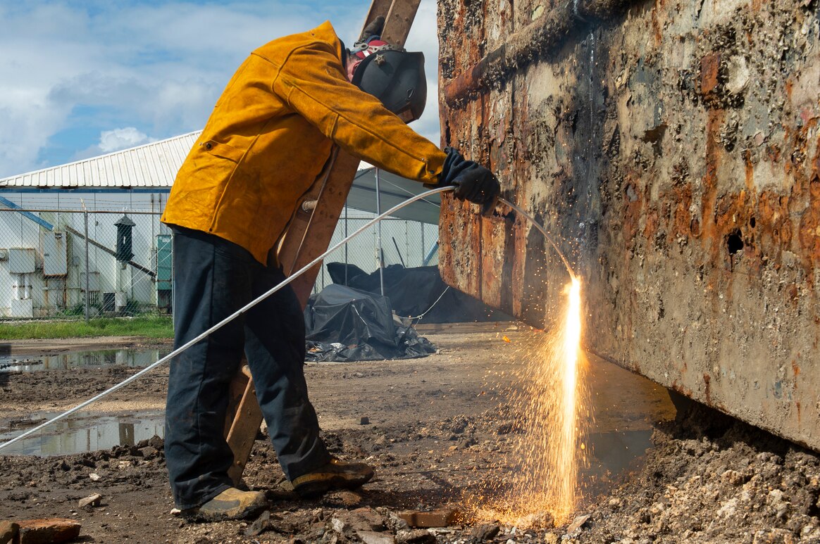 SANTA RITA, Guam (Nov. 10, 2021) Navy Diver 2nd Class Kolby Konopacky, from Stevens Point, Wis., attached to Navy Mobile Diving and Salvage Unit (MDSU) 1 uses a Keri Cable to cut up abandoned derelict vessels at the Guam Harbor of Refuge. Konopacky is part of a U.S. Navy team from Commander, Logistics Group Western Pacific, Task Force 73, and Task Force 75 which began removing abandoned derelict vessels at the harbor, in partnership with U.S. Coast Guard Forces Micronesia/Sector Guam, Guam Environmental Protection Agency, Bureau of Statistics and Plans, Guam Department of Agriculture, Guam Power Authority, and the Port Authority of Guam. (U.S. Navy photo by Mass Communication Specialist 2nd Class Sean P. Rinner)