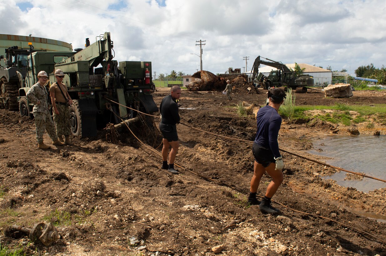 SANTA RITA, Guam (Nov. 10, 2021) Seabees assigned to Naval Mobile Construction Battalion (NMCB) 1 Detachment Guam and divers from Navy Mobile Diving and Salvage Unit (MDSU) 1 pull out the winch cable from a MK36 wrecker during at the Guam Harbor of Refuge. NMCB 1 Detachment Guam is forward-deployed to execute construction, humanitarian assistance, and theater security cooperation in the U.S. 7th Fleet areas of operation. (U.S. Navy photo by Mass Communication Specialist 2nd Class Sean P. Rinner)