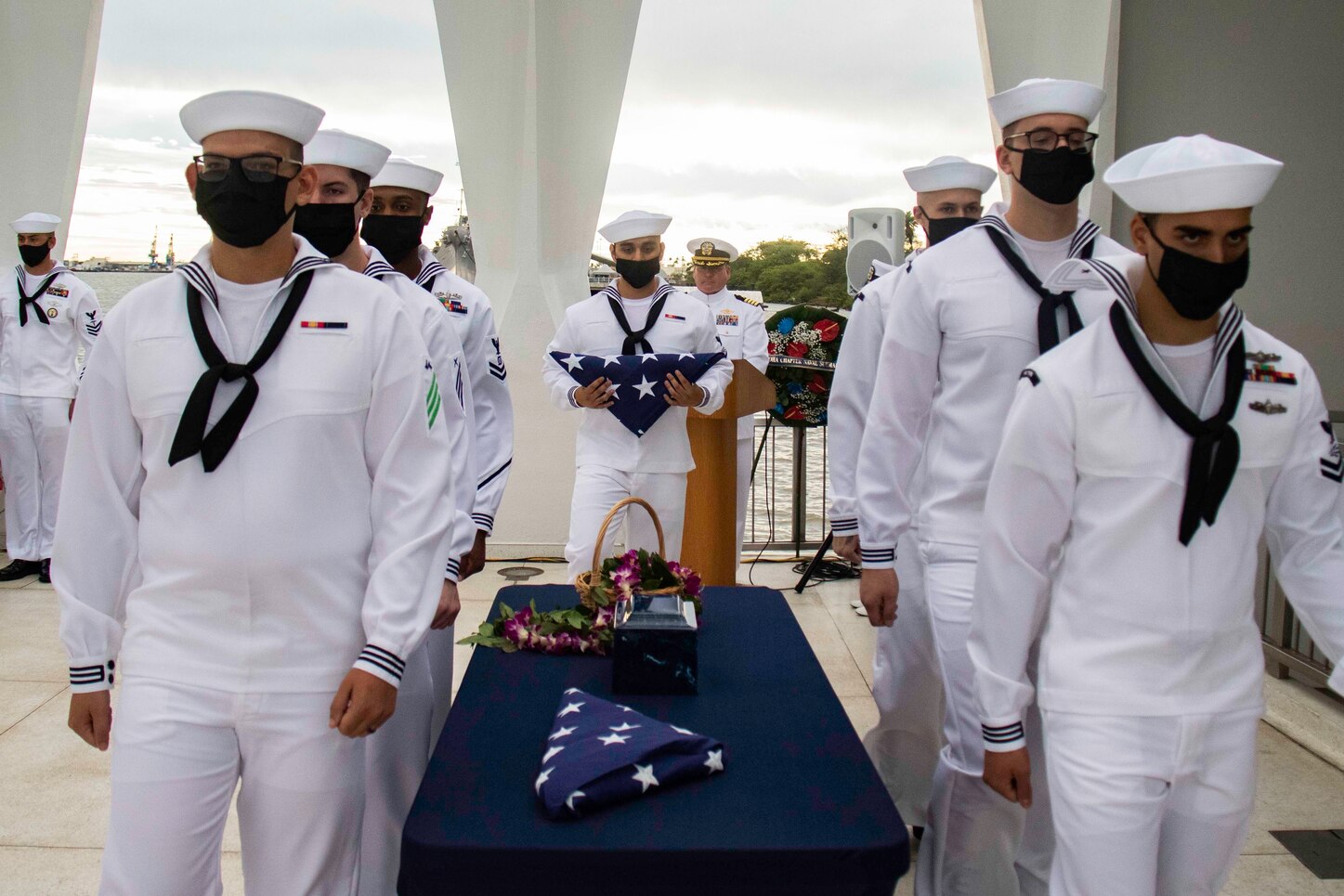 PEARL HARBOR (Dec. 7, 2021) The funeral honor guard of the USS Arizona Memorial detachment prepare a flag to be given to the daughter and granddaughter of World War II veteran and Pearl Harbor survivor Harvey Milhorn during the final interment ceremony on the USS Arizona. The ceremony was part of the 80th Anniversary Pearl Harbor Remembrance. Dec. 7, 2021, marks the 80th anniversary of the attacks on Pearl Harbor and Oahu. The U.S. military, State of Hawaii and National Park Service are hosting a series of remembrance events throughout the week to honor the courage and sacrifices of those who served throughout the Pacific Theater. Today, the U.S.-Japan Alliance is a cornerstone of peace and security in a free and open Indo-Pacific region. (U.S. Navy photo by Mass Communication Specialist 3rd Class Jeremy Lemmon Jr.)