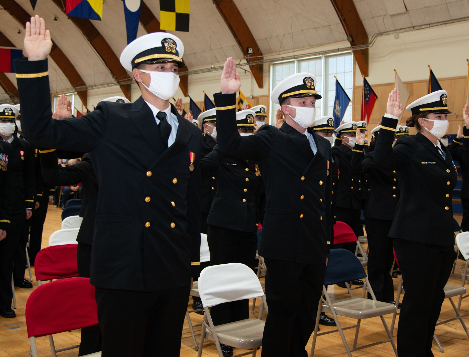 NEWPORT, RI (Dec. 3, 2021) Officer Candidate School (OCS) class 03-22 students at Officer Training Command Newport (OTCN), Rhode Island, reaffirm the oath of office during their graduation ceremony. OCS develops civilians and fleet Sailors into newly commissioned officers morally, mentally, and physically while also instilling them with the highest ideals of honor, courage, and commitment for service in the fleet as Naval officers. (U.S. Navy photo by Mass Communication Specialist 2nd Class Derien C. Luce)