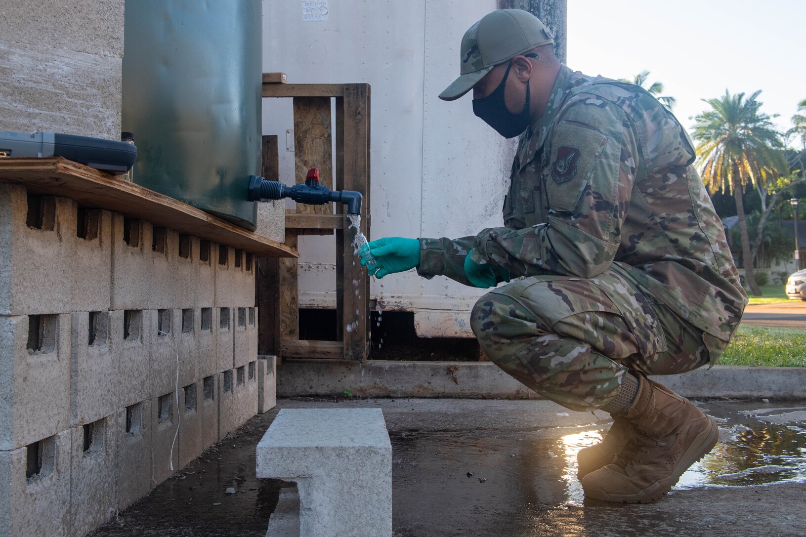 JOINT BASE PEARL HARBOR-HICKAM, Hawaii (Jan. 7, 2022) U.S. Air Force Staff Sgt. Andrew Travis, assigned to the 15th Operational Medical Readiness Squadron, 15th Medical Group, collects water from a bulk water storage tank at Hickam Elementary School for quality testing. The Interagency Drinking Water System Team is a joint initiative where the U.S. Navy is working closely with the Hawaii Department of Health, U.S. Environmental Protection Agency and the U.S. Army to restore safe drinking water to Joint Base Pearl Harbor-Hickam housing communities through sampling and flushing. For detailed information, go to www.navy.mil/jointbasewater. (U.S. Navy photo by Mass Communication Specialist Seaman Christopher Thomas)
