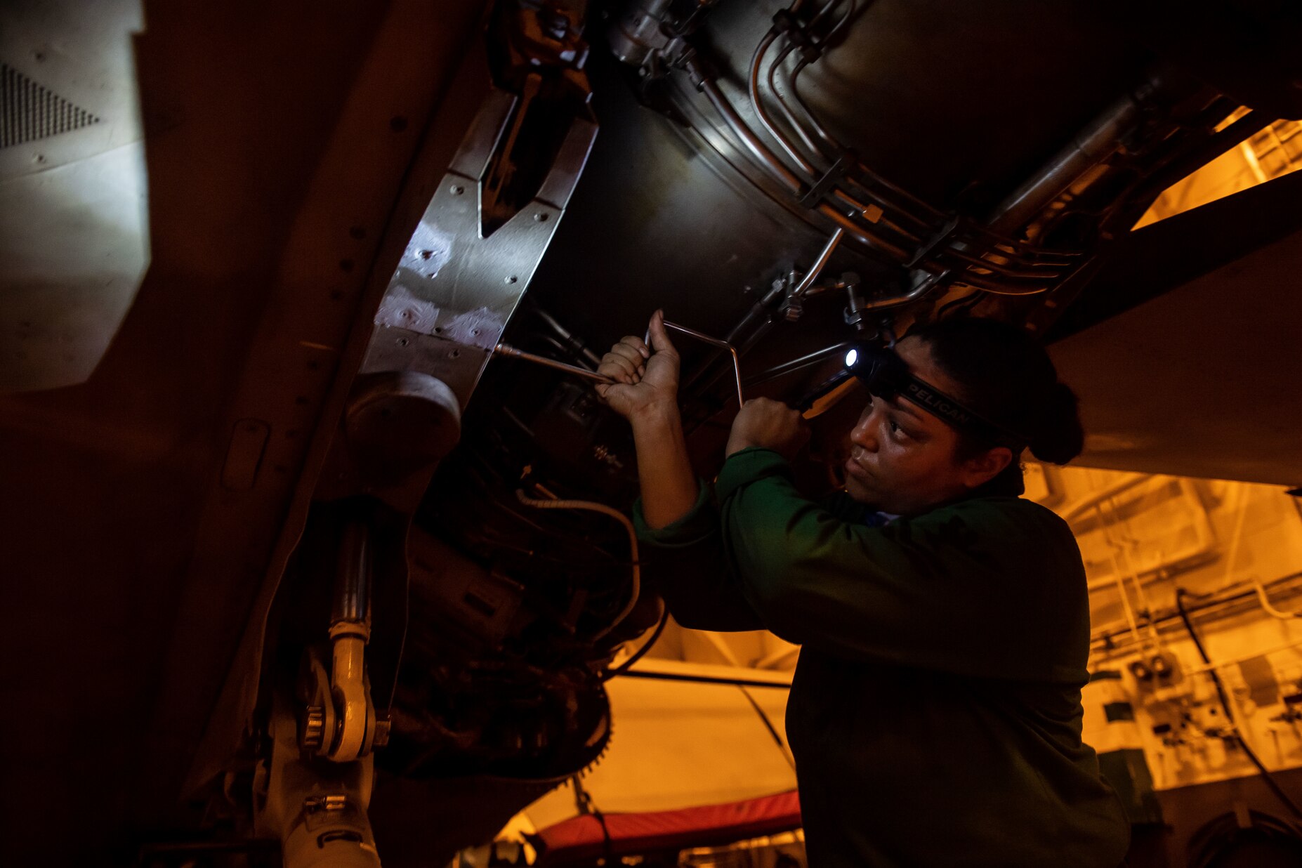 PHILIPPINE SEA (Jan. 9, 2021) Aviation Structural Mechanic 2nd Class Candace Boris, a native of Green Oak, Scotland, conducts maintenance on an F/A-18F Super Hornet, assigned to the �Bounty Hunters� of Strike Fighter Squadron (VFA) 2, in the hangar bay of the Nimitz-class aircraft carrier USS Carl Vinson (CVN 70), Jan. 9, 2021. The Carl Vinson Carrier Strike Group is on a scheduled deployment in the U.S. 7th Fleet area of operations to enhance interoperability through alliances and partnerships while serving as a ready-response force in support of a free and open Indo-Pacific region. (U.S. Navy photo by Mass Communication Specialist Seaman Sophia Simons)