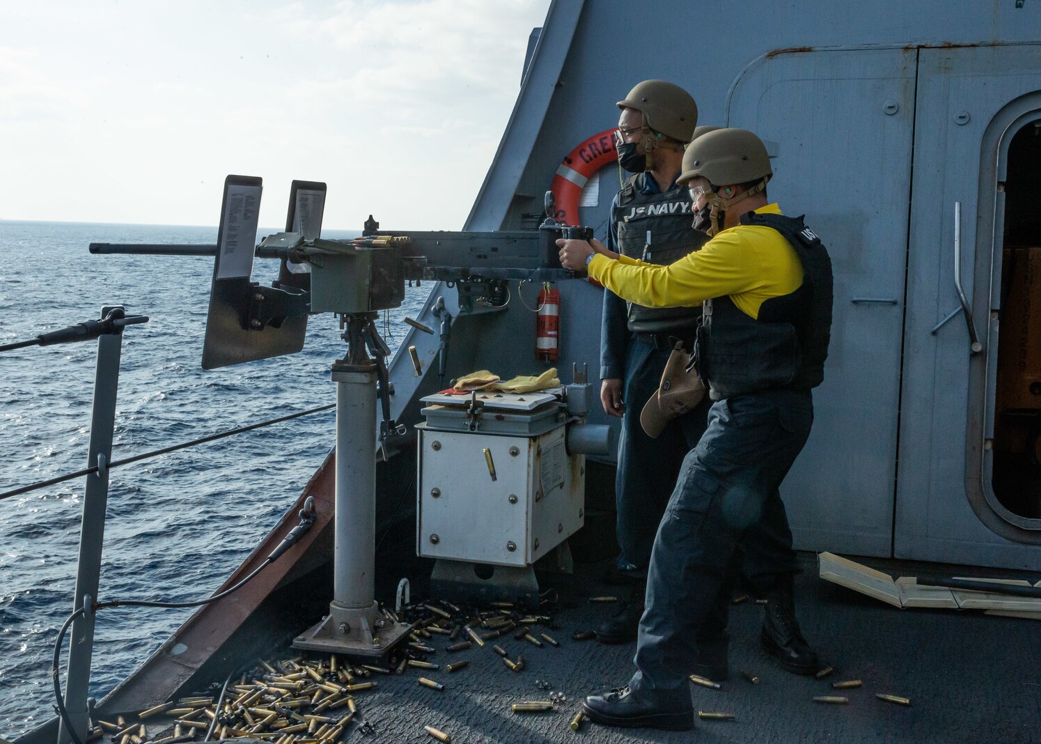 PHILIPPINE SEA (Jan. 27, 2022) Sailors conduct a live fire exercise aboard USS Green Bay (LPD 20) in the Philippine Sea, Jan. 27, 2022. The 31st Marine Expeditionary Unit is operating aboard the ships of the America Amphibious Ready Group in the 7th fleet area of operations to enhance interoperability with allies and partners and serve as a ready response to defend peace and stability in the Indo–Pacific Region. (U.S. Marine Corps photo by Lance Cpl. Yvonne Iwae)