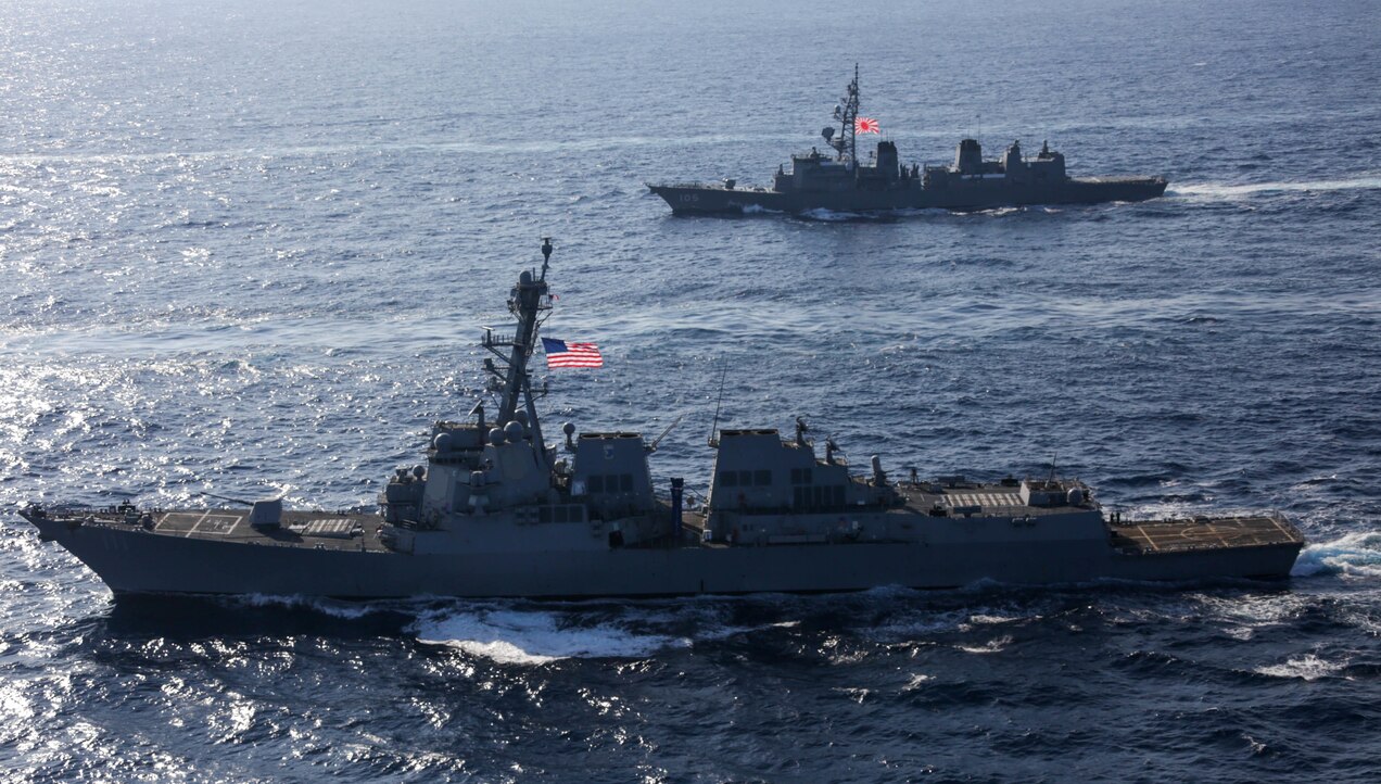 PHILIPPINE SEA (Feb. 16, 2022) The Arleigh Burke-class guided-missile destroyer USS Spruance (DDG 111) sail in formation with the Japan Maritime Self-Defense Force (JMSDF) Murasame-class destroyer JS Inazuma (DD 105) during exercise Jungle Warfare 2022 (JWX 22). JWX 22 is a large-scale training exercise focused on leveraging the integrated capabilities of joint and allied partners to strengthen all-domain awareness, maneuver and fires across a distributed maritime environment. (U.S. Navy photo by Mass Communication Specialist Seaman Aleksandr Freutel)
