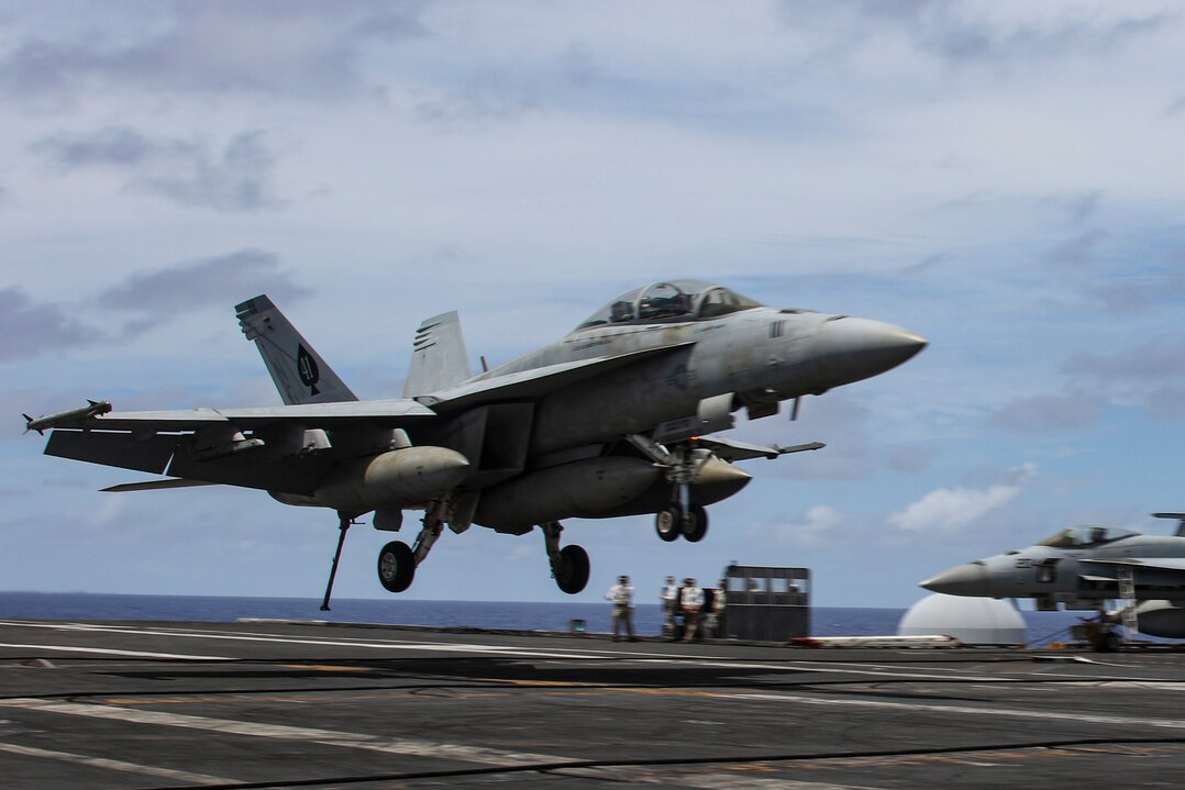 PHILIPPINE SEA (March 21, 2022) An F/A-18F Super Hornet, assigned to the "Black Aces" of Strike Fighter Squadron (VFA) 41, makes an arrested landing on the flight deck of the Nimitz-class aircraft carrier USS Abraham Lincoln (CVN 72), March 21, 2022. Abraham Lincoln Strike Group is on a scheduled deployment in the U.S. 7th Fleet area of operations to enhance interoperability through alliances and partnerships while serving as a ready-response force in support of a free and open Indo-Pacific region. (U.S. Navy photo by Mass Communication Specialist Seaman Apprentice Julia Brockman)