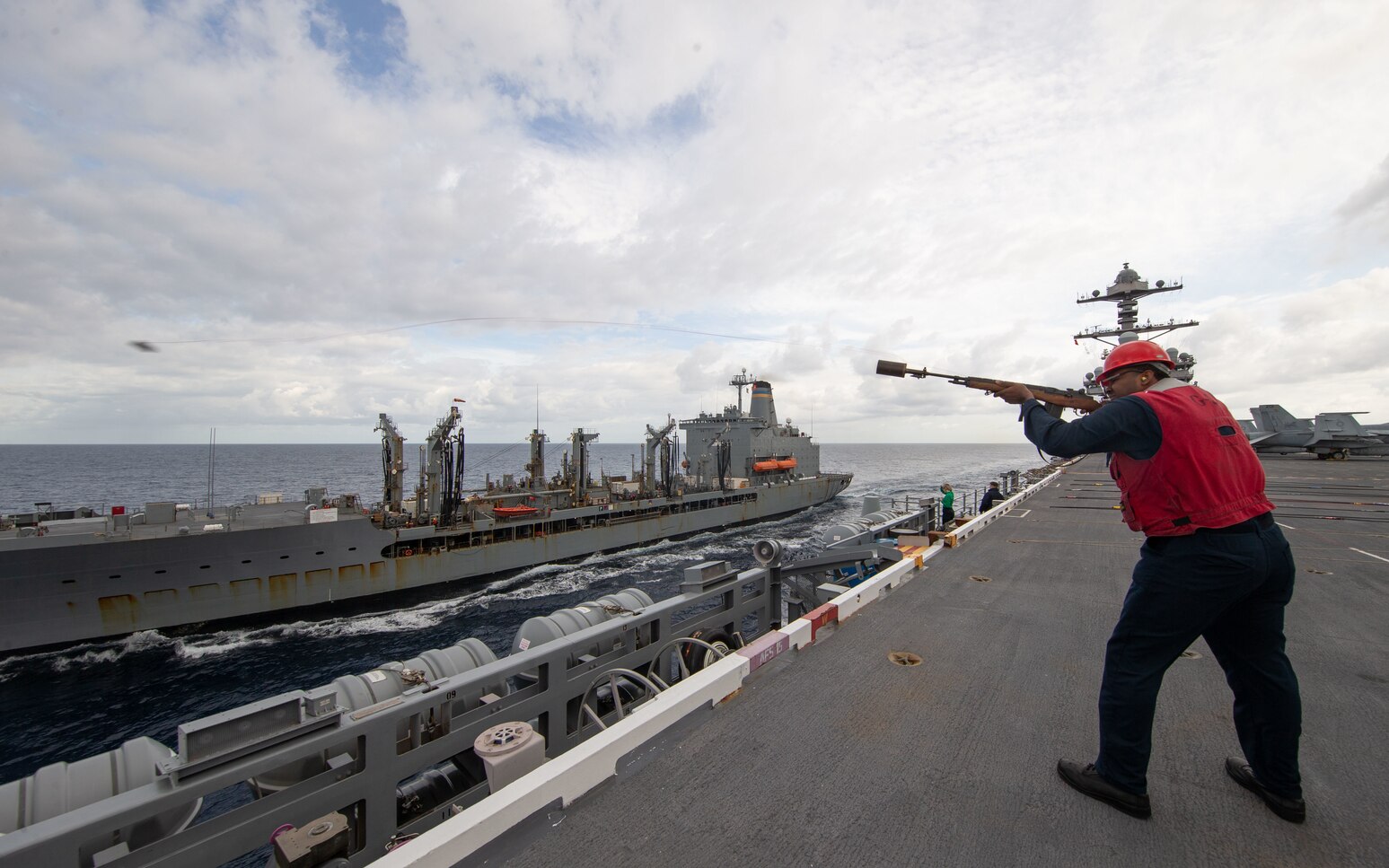 ATLANTIC OCEAN (March 23, 2022) Seaman Darius Webb, from Chicago, assigned to the weapons department aboard the aircraft carrier USS Gerald R. Ford (CVN 78), fires a messenger line to the fleet replenishment oiler USNS Kanawha (T-AO 196) during a fueling at sea in the Atlantic Ocean, March 23, 2022. Gerald R. Ford is conducting flight deck certification and air wing carrier qualifications as part the ship's tailored basic phase prior to operational deployment. (U.S. Navy photo by Mass Communication Specialist 2nd Class Zack Guth)