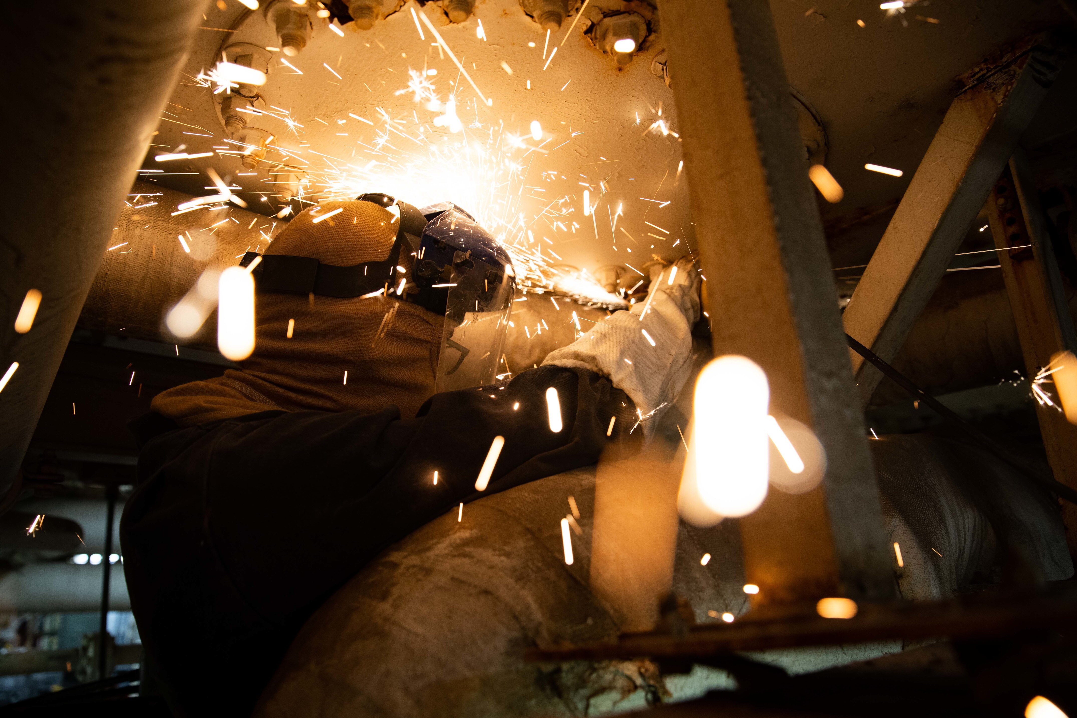 NORFOLK (March 23, 2022) Machinist's Mate 3rd Class Brendan Maw, assigned to the amphibious assault ship USS Bataan (LHD 5), grinds bolts the main machinery room, March 23, 2022. Bataan is homeported at Naval Station Norfolk. (U.S. Navy photo by Mass Communication Specialist 3rd Class Darren Newell)