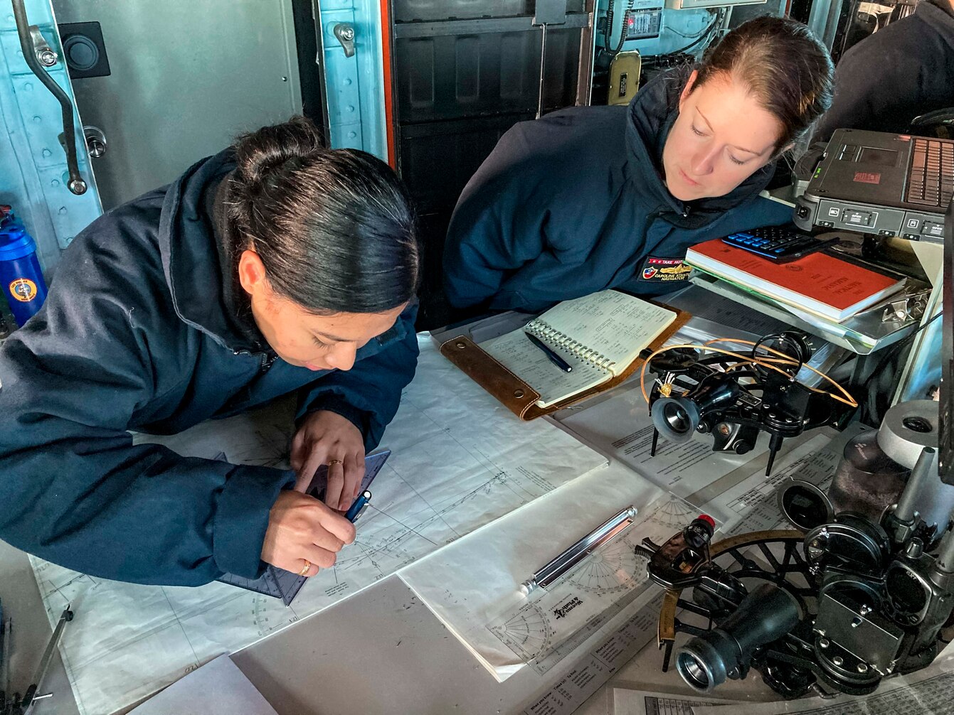 PACIFIC OCEAN (Feb. 28, 2022) Lt. Cmdr. Caroline Stanton, right, a native of Dowagiac, Mich. (right), and Quartermaster 3rd Class Orpha Hapdei, from Yap, Micronesia, both assigned to the amphibious assault ship USS Essex (LHD 2), plot a course in the ship’s pilot house, Feb. 28, 2022. Sailors and Marines of Essex Amphibious Ready Group (ARG) and the 11th Marine Expeditionary Unit (MEU) are underway conducting routine operations in U.S. 3rd Fleet. (U.S. Navy photo by Walter O’Donnell)