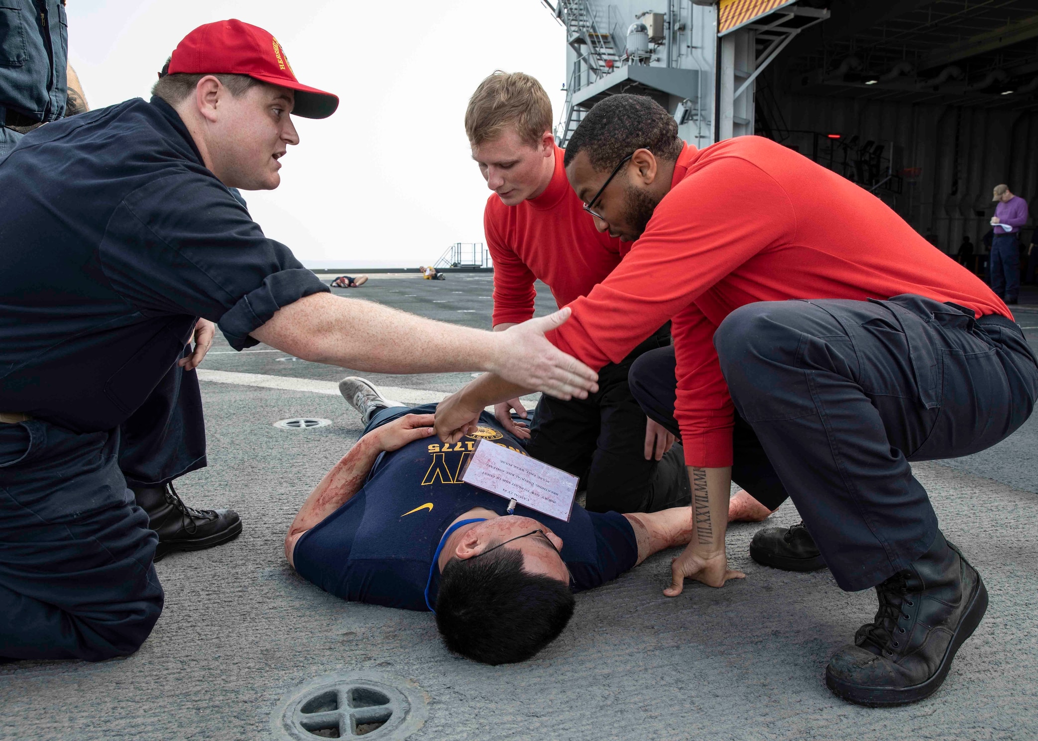 ATLANTIC OCEAN (March 28, 2022) Chief Yeoman Joshua Jones, left, issues instruction and training to Aviation Boatswain's Mate (Handling) Airman Patrick Adkins, middle, from Rome, Ga., and Airman Emery Mahamery, from Jasper, Fla., during a mass casualty drill aboard the Expeditionary Sea Base USS Hershel "Woody" Williams (ESB 4), March 28, 2022. Hershel "Woody" Williams is on a scheduled deployment in the U.S. Sixth Fleet area of operations in support of U.S. national interests and security in Europe and Africa. (U.S. Navy photo by Mass Communication Specialist 1st Class Fred Gray IV)