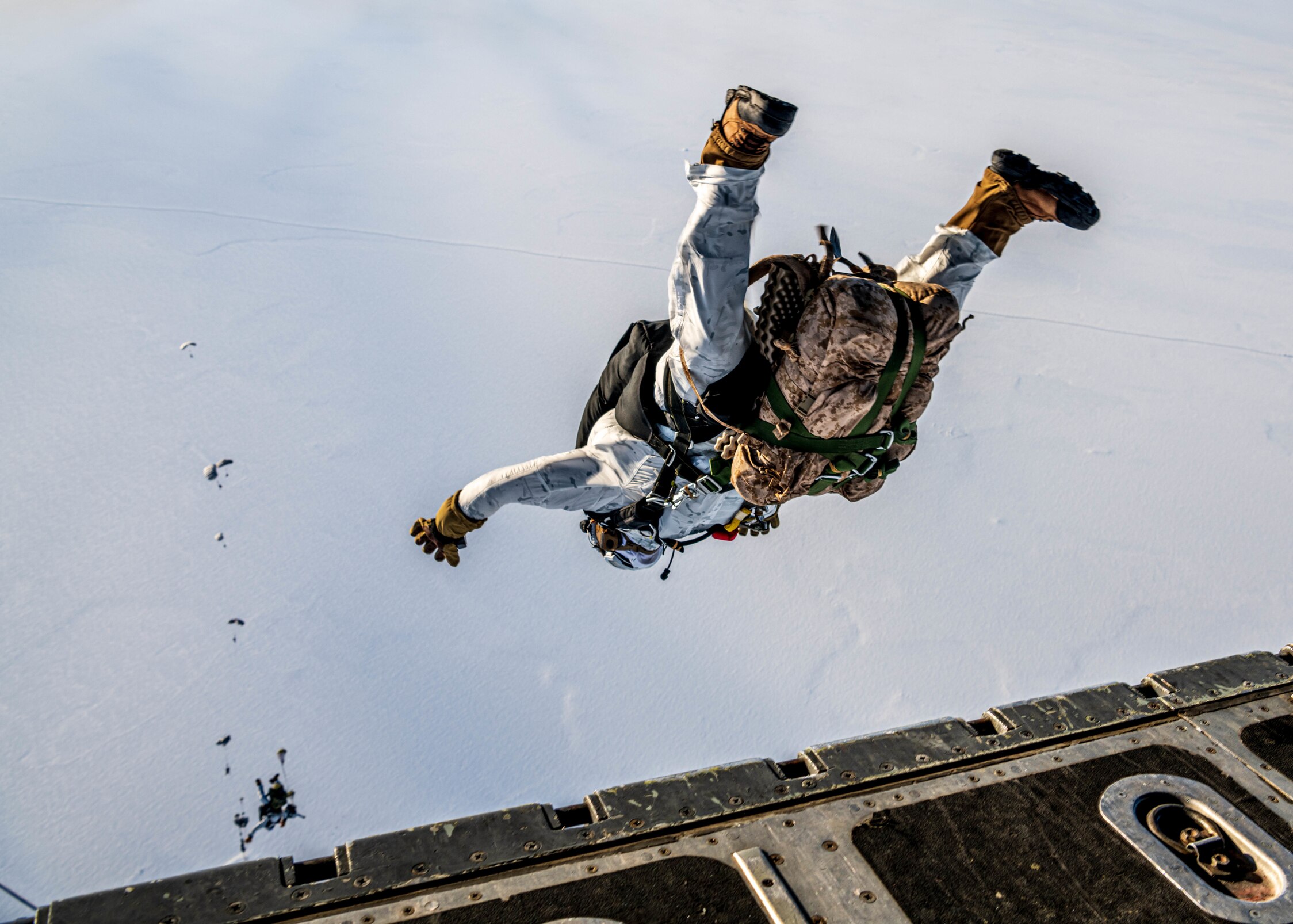 DEADHORSE, Alaska (March 9, 2022) Naval Special Warfare members perform a high-altitude low-opening jump, during the 2022 Arctic Edge Exercise, March 9, 2022. Arctic Edge is a U.S. Northern Command biennial defense exercise designed to demonstrate and exercise the ability to rapidly deploy and operate in the Arctic. (U.S. Navy Photo by Mass Communication Specialist 2nd Class Trey Hutcheson)