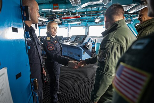 MEDITERRANEAN SEA (April 4, 2022) Cmdr. Iris Fivelstad, left, commanding officer of the Norwegian Navy Fridtjof Nansen-class frigate HNoMS Fridtjof Nansen (F-310), welcomes Capt. Patrick Hourigan, commander, Carrier Air Wing (CVW) 1 on Nansen’s bridge, April 4, 2022. HNoMS Fridtjof Nansen is currently assigned to the Harry S. Truman Carrier Strike Group, on a scheduled deployment in the U.S. Sixth Fleet area of operations in support of naval operations to maintain maritime stability and security, and defend U.S., allied and partner interest in Europe and Africa. (Photo by Petty Officer Marius Vaagenes Villanger / Norwegian Armed Forces.)