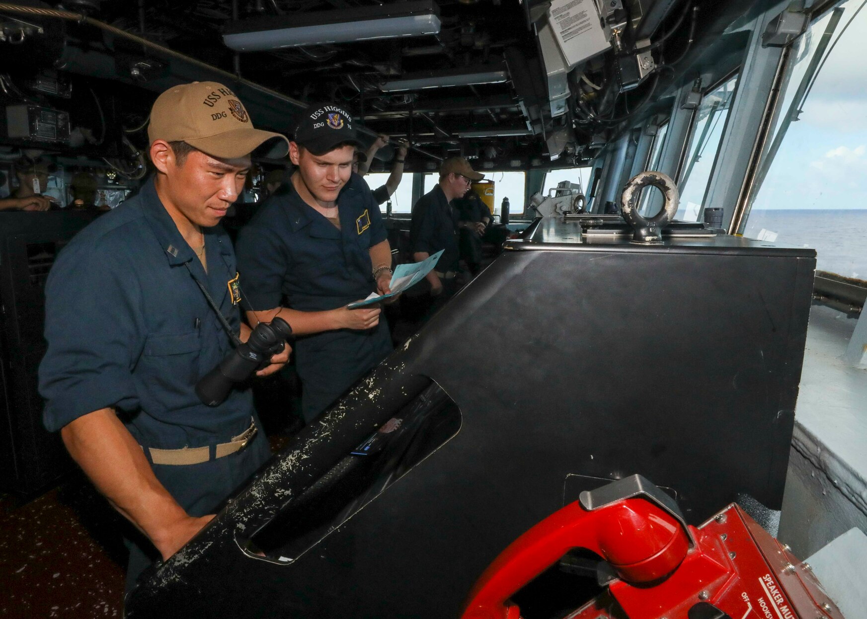PHILIPPINE SEA (March 20, 2022) Lt. John Arion (right), from Dallas, Texas, and Lt. j.g. Joseph Kaplan (left), from Denver, monitor navigation from the pilot house of the Arleigh Burke-class guided-missile destroyer USS Higgins (DDG 76), March 20, 2022. Higgins is assigned to Commander, Task Force (CTF) 71/Destroyer Squadron (DESRON) 15, the Navy’s largest forward-deployed DESRON and the U.S. 7th Fleet’s principal surface force. (U.S. Navy photo by Mass Communication Specialist 2nd Class Arthur Rosen)
