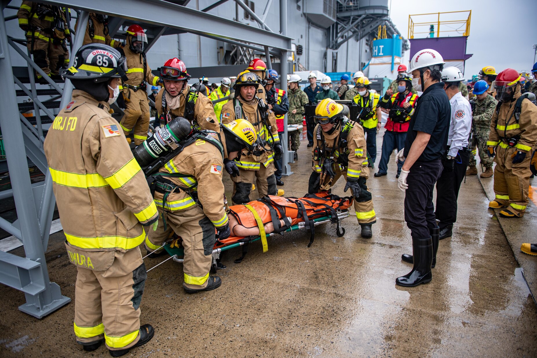 SASEBO, Japan (April 21, 2022) Firefighters from Commander, Navy Region Japan Emergency Services carry a simulated casualty from the forward-deployed amphibious assault ship USS America (LHA 6) while training to fight a fire in an industrial maintenance environment, April 21, 2022. America, lead ship of the America Amphibious Ready Group, is operating in the U.S. 7th Fleet area of responsibility to enhance interoperability with allies and partners and serve as a ready response force to defend peace and stability in the Indo-Pacific region. (U.S. Navy photo by Mass Communication Specialist 3rd Thomas B. Contant)