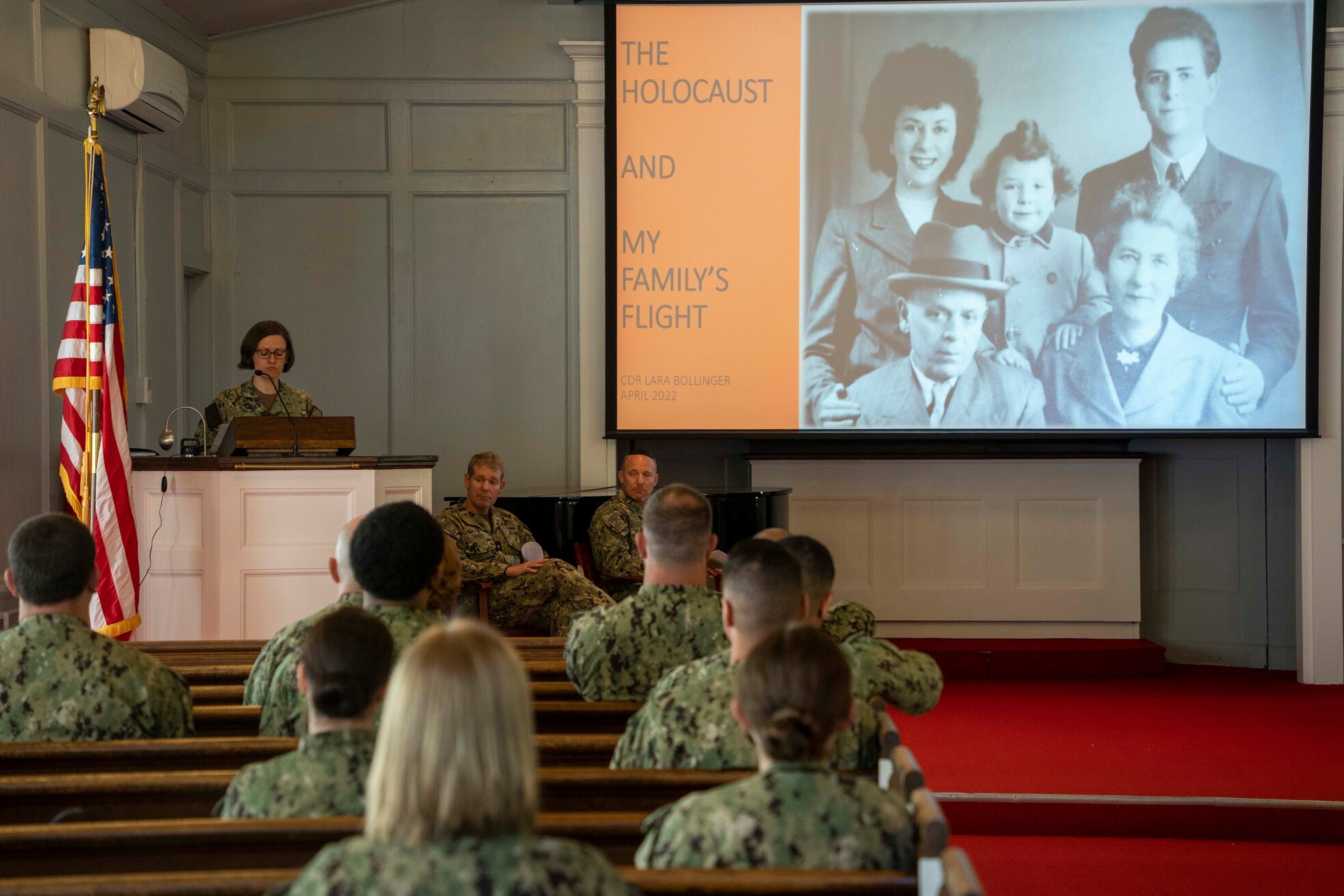 NORFOLK (April 28, 2022) Cmdr. Lara Bollinger, public affairs officer for Commander, U.S. 2nd Fleet, delivers remarks during a Holocaust Day of Remembrance ceremony, April 28, 2022 at Naval Station Norfolk. Congress established Days of Remembrance as the nation's annual commemoration of the Holocaust. (U.S. Navy photo by Mass Communication Specialist 2nd Class Anderson W. Branch)