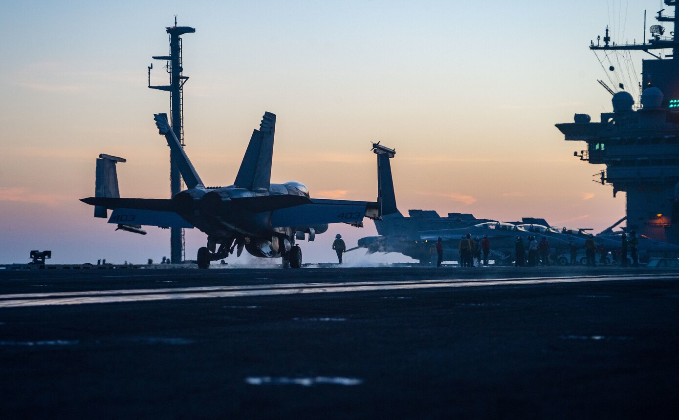 MEDITERRANEAN SEA (May 20, 2022) An F/A-18E Super Hornet attached to the Blue Blasters of Strike Fighter Squadron (VFA) 34 prepares to launch from the flight deck of the aircraft carrier USS Harry S. Truman (CVN 75), May 20, 2022. The Harry S. Truman Carrier Strike Group is on a scheduled deployment in the U.S. Naval Forces Europe area of operations, employed by U.S. Sixth Fleet to defend U.S., Allied and Partner interests. (U.S. Navy photo by Mass Communication Specialist 3rd Class Miles McDonough)