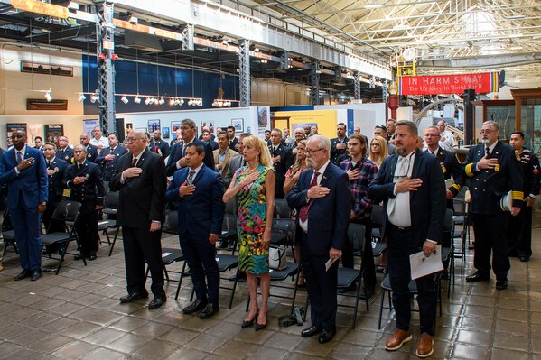 Firefighters, emergency technicians, family and friends from across Commander, Navy Installations Command’s 10 regions and 71 installations place their hands above their hearts during the annual Navy Fire and Emergency Services (F&ES) Awards ceremony at the historic Washington Navy Yard’s U.S. Navy Museum, May 18. The Navy F&ES Awards Program was instituted in 1997 to recognize the most outstanding fire departments and personnel for achieving the highest degree of excellence in mission support and fire protection management. (U.S. Navy photo by Chief Mass Communication Specialist Brian Morales)