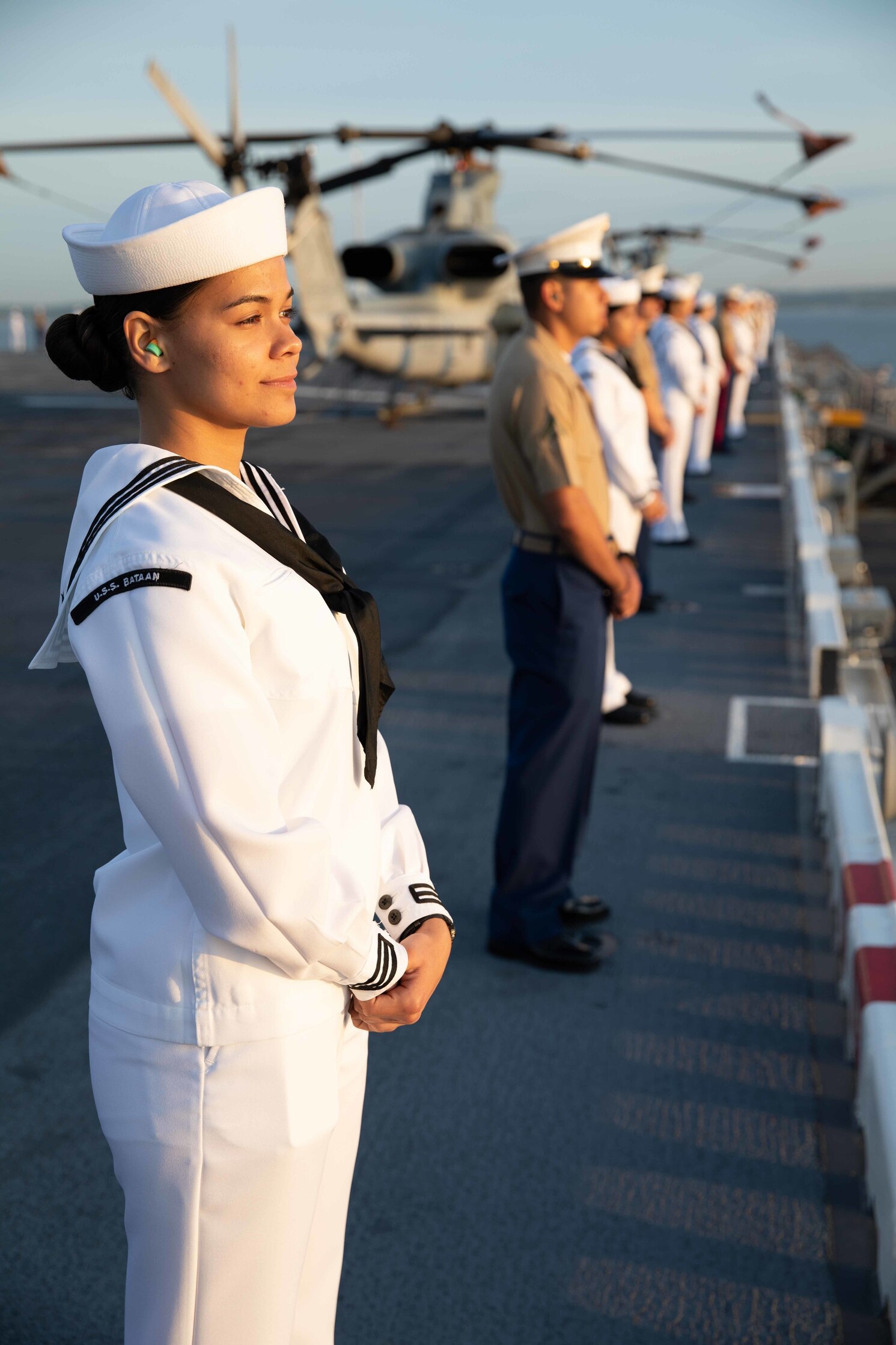 NEW YORK (May 25, 2022) Hospitalman Celiam Toro Arizmendi, assigned to the amphibious assault ship USS Bataan (LHD 5), mans the rails on the flight deck during Fleet Week New York, May 25, 2022. Bataan is underway in the 2nd fleet area of operations. Bataan is homeported at Naval Station Norfolk. (U.S. Navy photo by Mass Communication Specialist 3rd Class Jennifer Newsome)