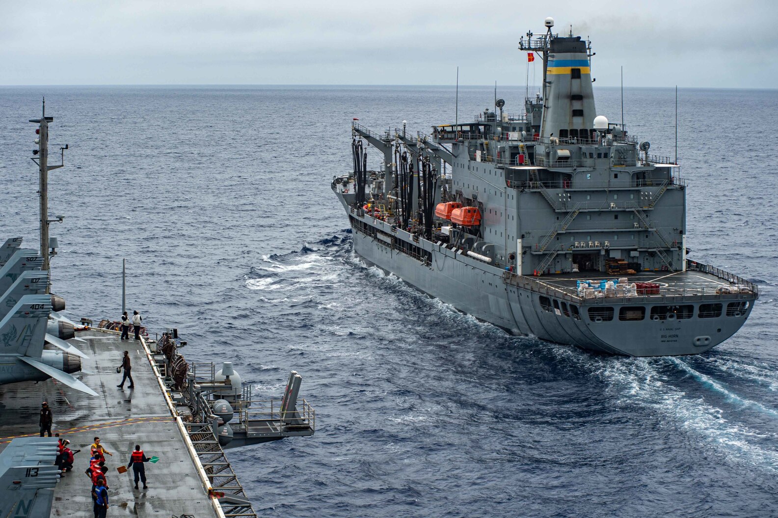 PHILIPPINE SEA (May 27, 2022) The U.S. Navy's only forward-deployed aircraft carrier USS Ronald Reagan (CVN 76), approaches the Military Sealift Command Henry J. Kaiser-class replenishment oiler USNS Big Horn (T-AO 198) in preparation for a replenishment-at-sea. During the evolution, Big Horn transported fuel and cargo to Ronald Reagan via connected replenishment. Ronald Reagan, the flagship of Carrier Strike Group 5, provides a combat-ready force that protects and defends the United States, and supports alliances, partnerships and collective maritime interests in the Indo-Pacific region. (U.S. Navy photo by Mass Communication Specialist 3rd Class Daniel G. Providakes)