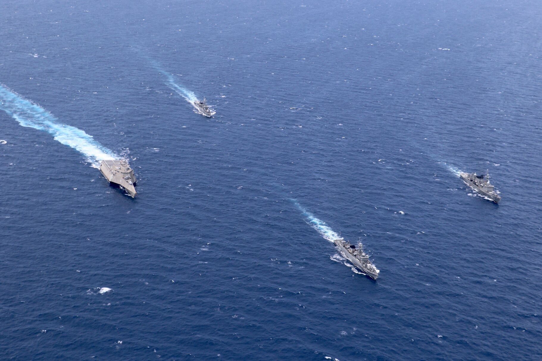 GULF OF THAILAND (May 27, 2022) The Royal Thai Navy Chao Phraya-class frigates HTMS Kraburi (FFG 457), HTMS Bangpakong (FFG 456) and Naresuan-class frigate HTMS Naresuan (FFG 421) sail in formation with the Independence-variant littoral combat ship USS Jackson (LCS 6) during Cooperation Afloat Readiness and Training (CARAT) Thailand 2022, May 27, 2022. CARAT Thailand is an annual bilateral naval exercise between the U.S. Navy and Royal Thai Navy. Thailand has been part of the CARAT exercise series since 1995. Now in its 28th year, the CARAT series comprises multiple multinational exercises, designed to enhance U.S. and allied and partner navies’ abilities to operate together in response to traditional and non-traditional maritime security challenges in the Indo-Pacific. (U.S. Navy photo by Lt. j.g. Alexandra Green)