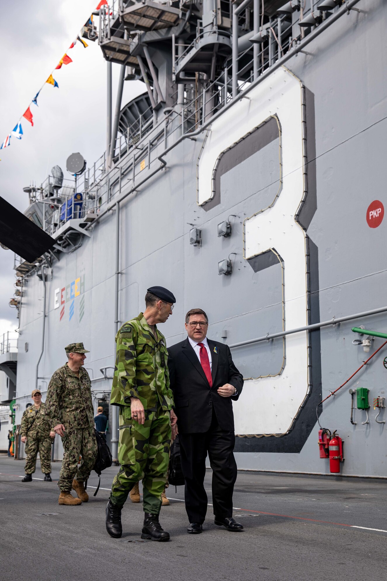 STOCKHOLM (June 4, 2022) Swedish Armed Forces General Micael Byden, left, speaks with Mr. Erik D. Ramanathan, U.S. Ambassador to the Kingdom of Sweden, during a ship tour aboard the Wasp-class amphibious assault ship USS Kearsarge (LHD 3) in Stockholm, Sweden, June 4, 2022. The Kearsarge Amphibious Ready Group and the 22nd MEU, under the command and control of Task Force 61/2, is on a scheduled deployment in the U.S. Naval Forces Europe area of operations, employed by U.S. 6th Fleet to defend U.S., allied and partner interests. (U.S. Marine Corps photo by Sgt. Armando Elizalde)