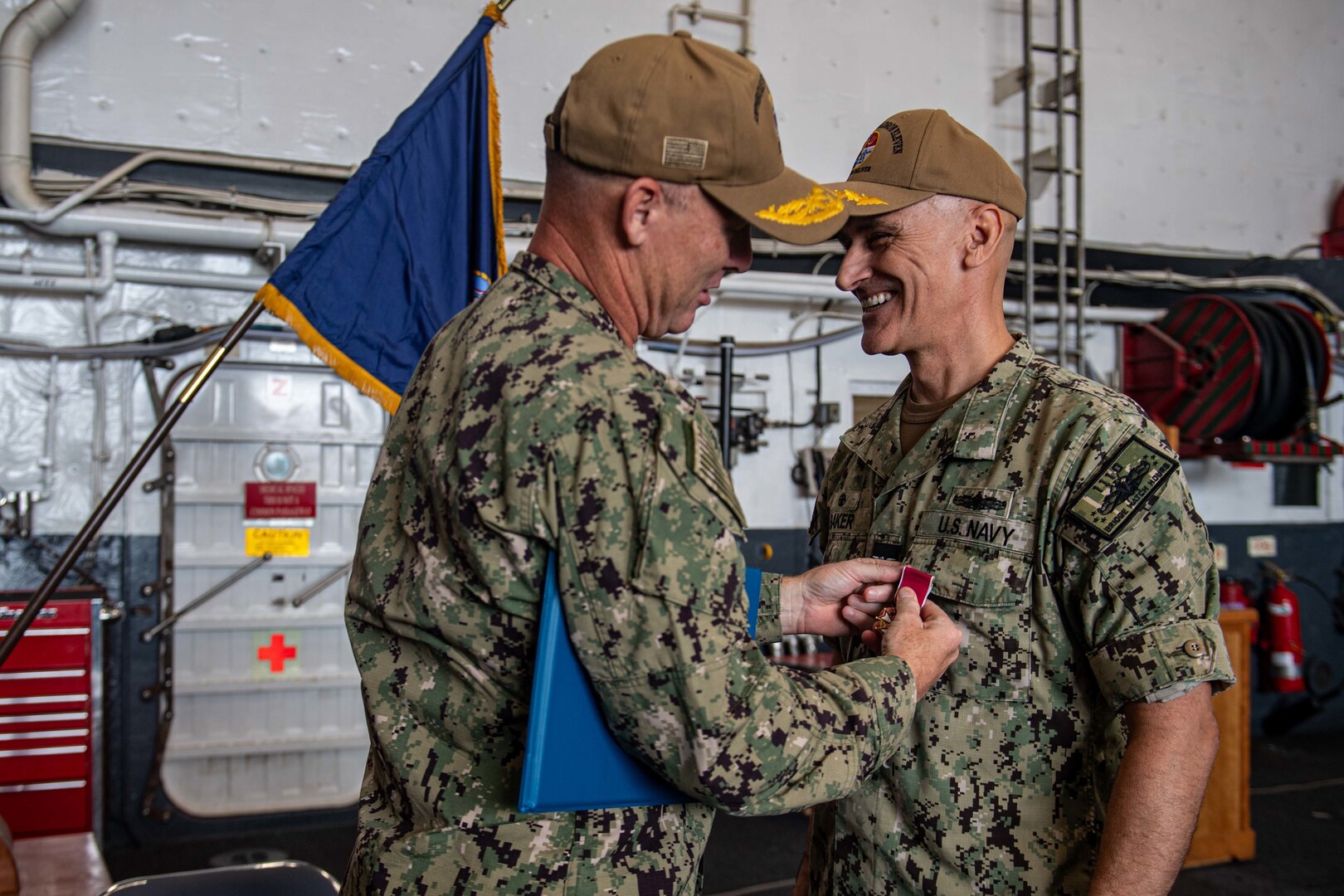 SASEBO, Japan (June 10, 2022) Captain Greg Baker, Commodore, Amphibious Squadron 11, right, receives the Legion of Merit during his change-of-command ceremony in the hangar bay of the forward-deployed amphibious transport dock ship USS New Orleans (LPD 18), June 10, 2022. Amphibious Squadron 11 is operating in the U.S. 7th Fleet area of responsibility to enhance interoperability with allies and partners, and serve as a ready response force to defend peace and stability in the Indo-Pacific region. (U.S. Navy photo by Mass Communication Specialist 3rd Class Thomas B. Contant)