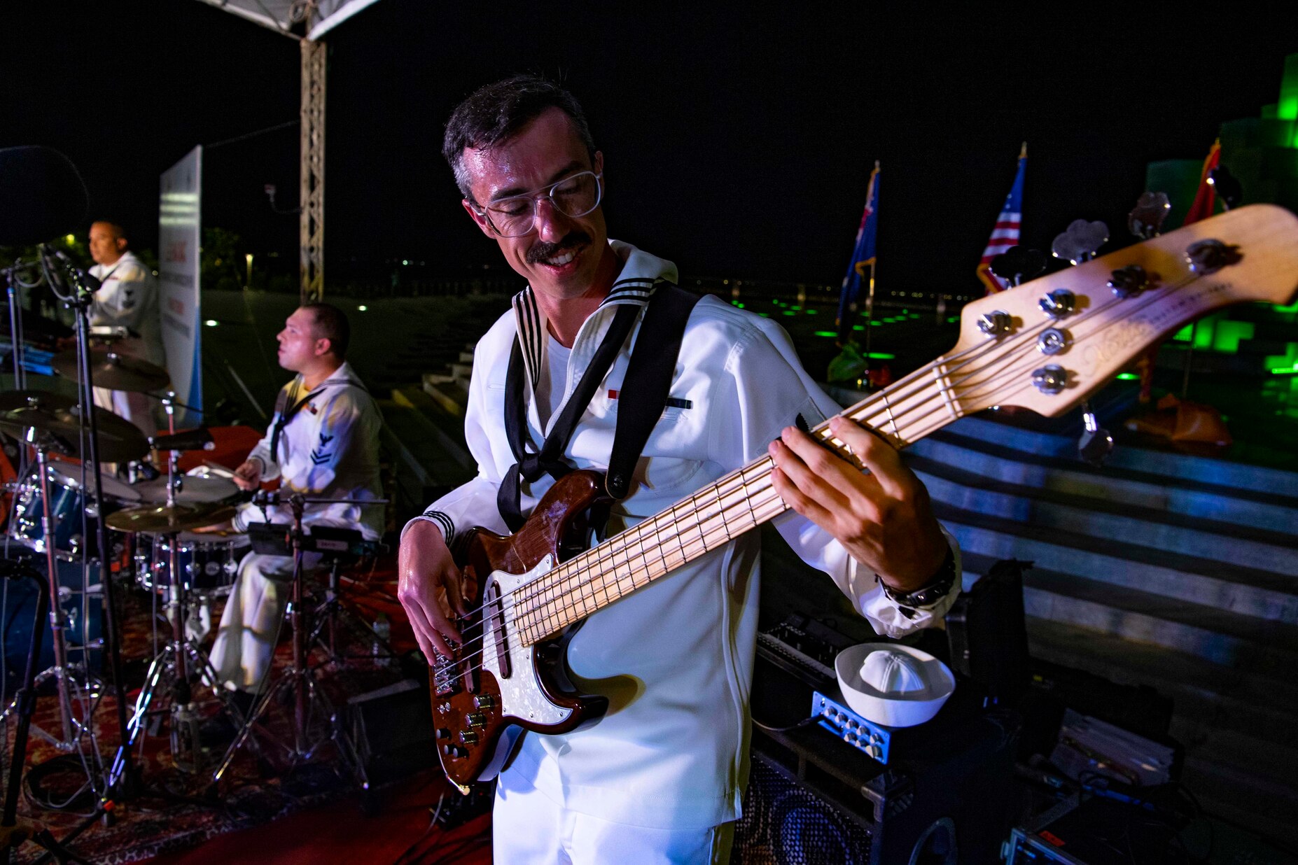 PHU YEN, Vietnam (June 20, 2022) Musician 3rd Class Erik Muench, from Wekiva Springs, Florida, a bass guitarist in the Commander, U.S. Pacific Fleet Rock Band, performs during the Pacific Partnership 2022 Vietnam Opening Ceremony. Now in its 17th year, Pacific Partnership is the largest annual multinational humanitarian assistance and disaster relief preparedness mission conducted in the Indo-Pacific. (U.S. Navy photo by Mass Communication Specialist 1st Class Shamira Purifoy)
