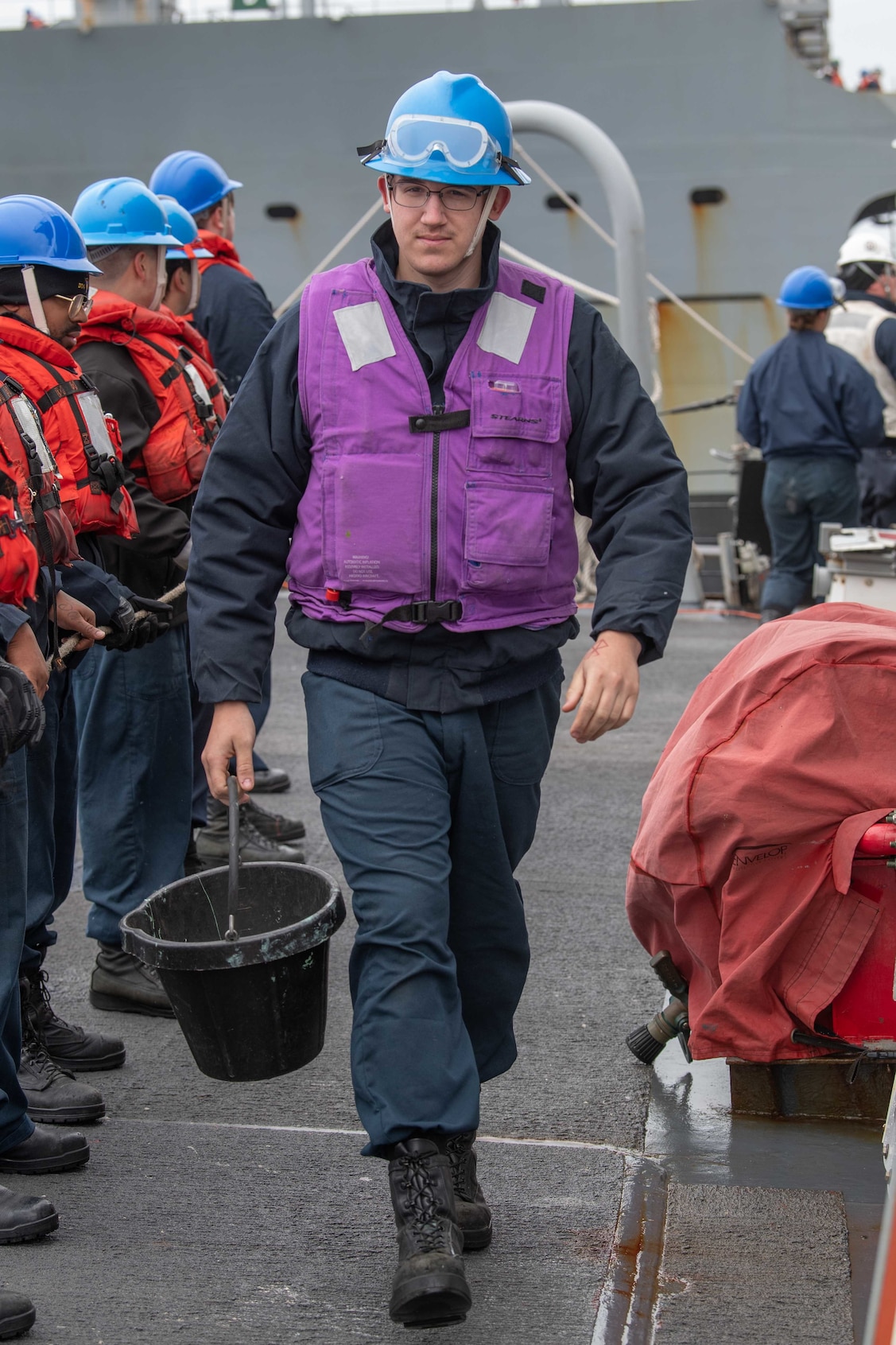 PHILIPPINE SEA (May 30, 2022) Gas Turbine Specialist (Mechanical) Fireman Cody Cargill, from Nashua, N.H., carries a fuel sample aboard the Arleigh Burke-class guided-missile destroyer USS Milius (DDG 69) during a replenishment-at-sea with Henry J. Kaiser-class fleet replenishment oiler USNS Rappahannock (T-AO 204), May 30, 2022. Milius is assigned to Task Force 71/Destroyer Squadron (DESRON) 15, the Navy’s largest forward-deployed DESRON and the U.S. 7th fleet’s principal surface force. (U.S. Navy photo by Mass Communication Specialist 2nd Class James S. Hong)