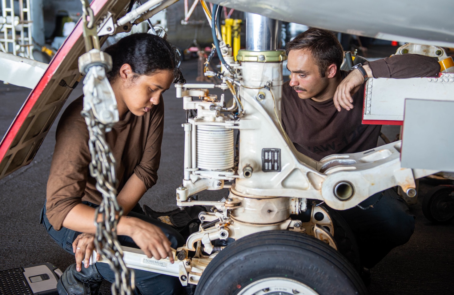 MEDITERRANEAN SEA (Aug. 3, 2022) Aviation Electrician's Mate Brianna Souvenir, left, from Seguin, Texas, and Airman Isaiah Hardee, from Louisville, Kentucky, assigned to the "Seahawks" of Airborne Command and Control Squadron (VAW) 126, inspect the landing gear of an E-2D Hawkeye in the hangar bay of the Nimitz-class aircraft carrier USS Harry S. Truman (CVN 75), Aug. 3, 2022. The Harry S. Truman Carrier Strike Group is on a scheduled deployment in the U.S. Naval Forces Europe area of operations, employed by U.S. 6th Fleet to defend U.S., allied and partner interests. (U.S. Navy photo by Mass Communication Specialist 3rd Class Hunter Day)