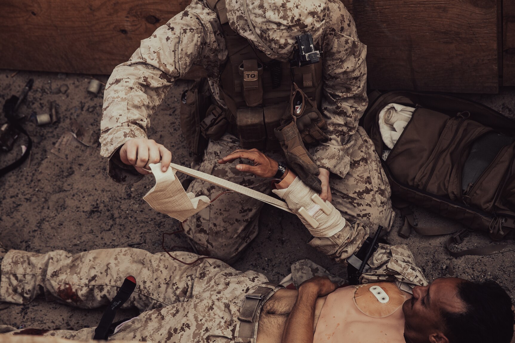 TWENTYNINE PALMS, Calif. (Aug. 3, 2022) U.S. Navy Seaman Colby Snoddy, a corpsman with 2nd Battalion, 7th Marine Regiment, 1st Marine Division, wraps a compression bandage around the arm of a simulated casualty during a live-fire training event at Marine Corps Air Ground Combat Center in Twentynine Palms, California, Aug. 3, 2022. The Marines conducted a squad attack at Range 410, which provides close proximity to targets, obstacles to breach, and a variety of weapon assets including mortars, rockets, and machine guns. (U.S. Marine Corps photo by Cpl. Shane T. Beaubien)
