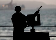 DJIBOUTI, Djibouti (July 29, 2022) Airman Andrew Goldsborough, from Leonardtown, Md., stands watch aboard the Lewis B. Puller-class expeditionary sea base USS Hershel "Woody" Williams (ESB 4) as the ship arrives in Djibouti, July 29, 2022. Hershel "Woody" Williams is rotationally deployed to the U.S. Naval Forces Africa area of operations, employed by U.S. Sixth Fleet, to defend U.S., allied and partner interests. (U.S. Air Force photo by Staff Sgt. Dylan Murakami)