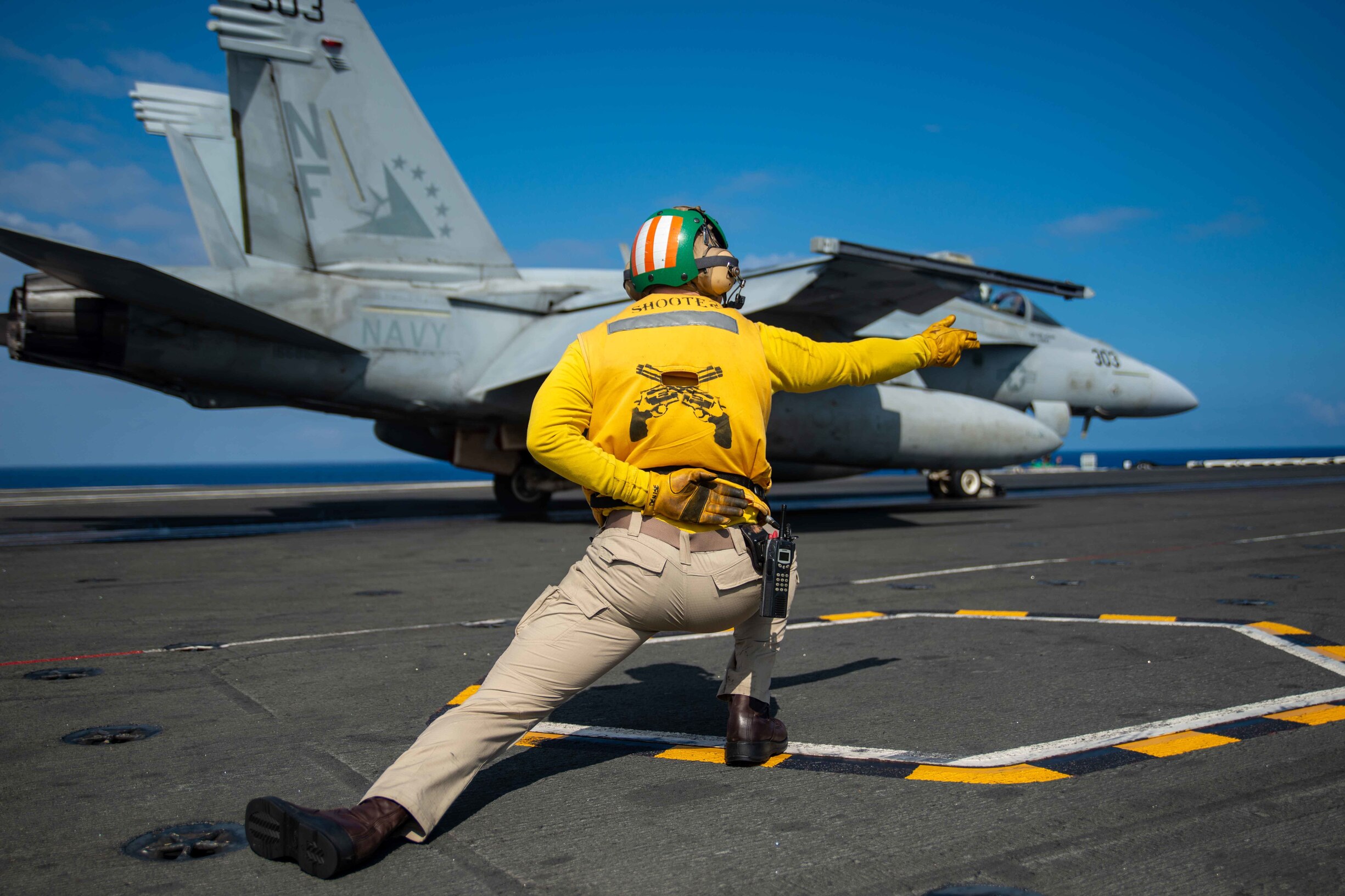 PHILIPPINE SEA (Aug. 9, 2022) Lt. TJ Whiting, from Baltimore, launches an F/A-18E Super Hornet attached to the "Eagles" of Strike Fighter Squadron (VFA) 115 on the flight deck of the U.S. Navy's only forward-deployed aircraft carrier USS Ronald Reagan (CVN 76) in the Philippine Sea. The Eagles conduct carrier-based air strike and strike force escort missions, as well as ship, battle group, and intelligence collection operations. Ronald Reagan, the flagship of Carrier Strike Group 5, provides a combat-ready force that protects and defends the United States, and supports alliances, partnerships and collective maritime interests in the Indo-Pacific region. (U.S. Navy photo by Mass Communication Specialist 3rd Class Gray Gibson)
