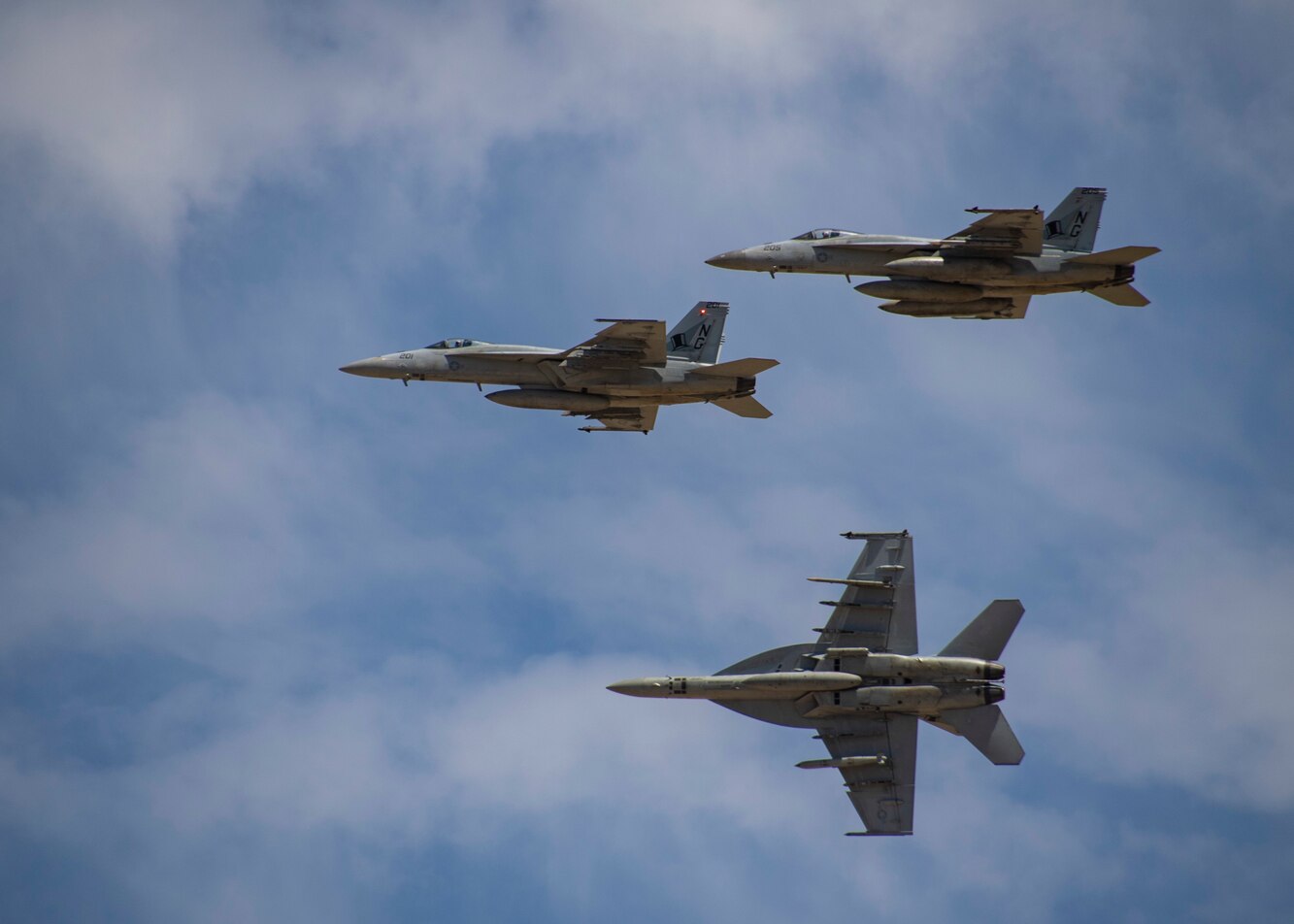 NAVAL AIR STATION LEMOORE, Calif., (Aug. 9, 2022) F/A-18E Super Hornets from the "Tophatters" of Strike Fighter Squadron (VFA) 14 fly over Naval Air Station Lemoore. VFA-14, as part of Carrier Air Wing (CVW) 9, embarked aboard the aircraft carrier USS Abraham Lincoln (CVN 72) and returned to Naval Air Station Lemoore, Aug. 9, 2022, following a seven-month deployment to U.S. 3rd Fleet and 7th Fleet areas of operations. CVW-9 deployed with a combination of fourth and fifth-generation platforms that predominantly represent the "Airwing of the Future," executing more than 21,307 fixed-wing and helicopter flight hours comprising of 10,250 sorties, 8,437 launches and 8,487 aircraft arrestments. (U.S. Navy photo by Mass Communication Specialist 1st Class Emiline L. M. Senn)