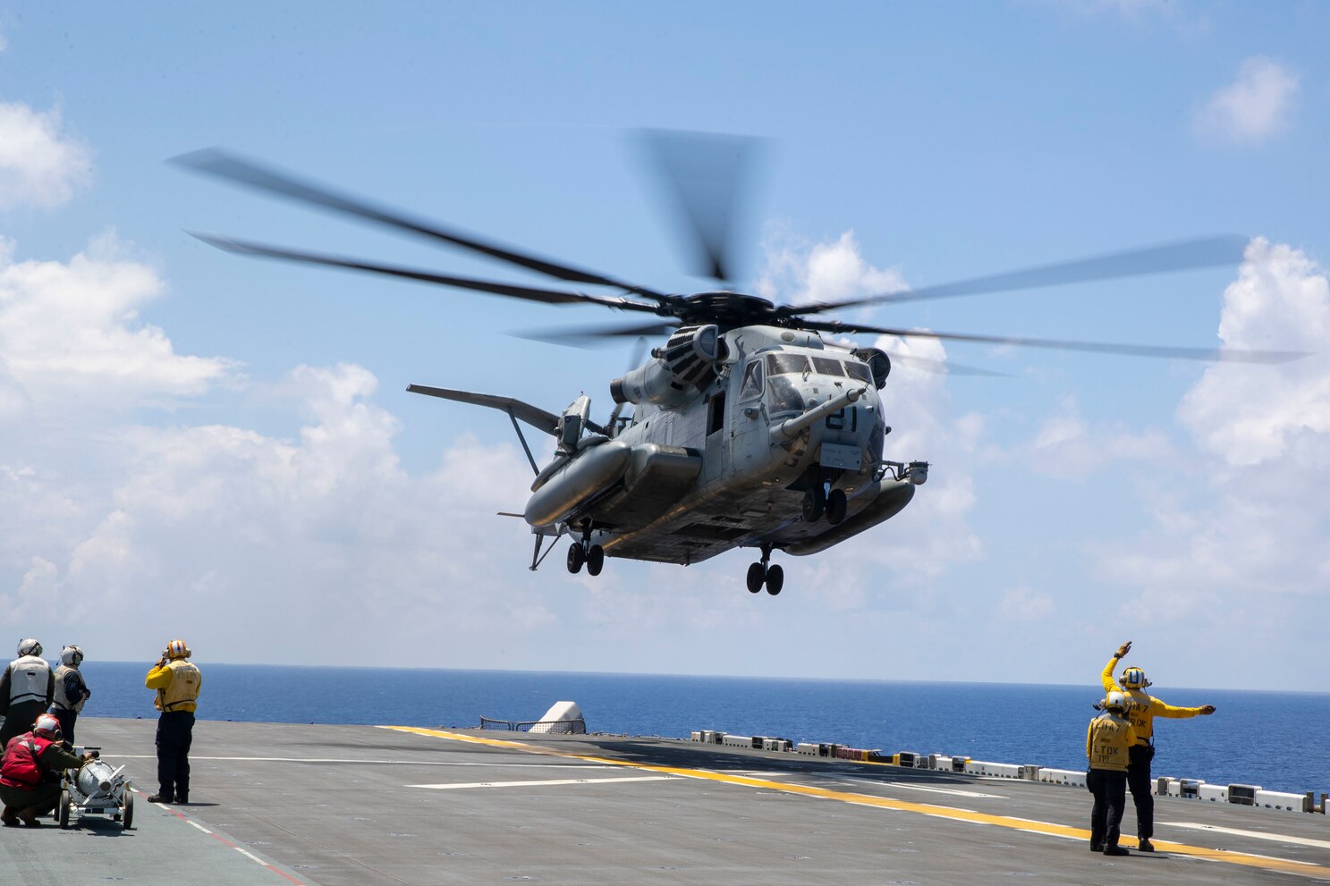 PHILIPPINE SEA (Aug. 9, 2022) A CH-53 Super Stallion helicopter assigned to Marine Medium Tiltrotor Squadron (VMM) 262 (Reinforced) takes off from the amphibious assault ship USS Tripoli (LHA 7), Aug. 9, 2022. Tripoli is operating in the U.S. 7th Fleet area of operations to enhance interoperability with allies and partners and serve as a ready response force to defend peace and maintain stability in the Indo-Pacific region. (U.S. Navy photo by Mass Communication Specialist 2nd Class Malcolm Kelley)