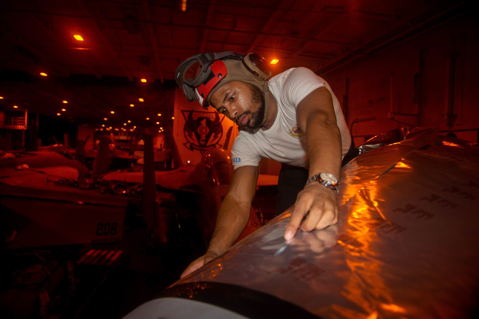 MEDITERRANEAN SEA (Aug. 9, 2022) Aviation Ordnanceman Airman Cortny Pruitt, from Dallas, assigned to the "Red Rippers" of Strike Fighter Squadron (VFA) 11, prepares an F/A-18F Super Hornet for a paint job in the hangar bay of the Nimitz-class aircraft carrier USS Harry S. Truman (CVN 75), Aug. 9, 2022. The Harry S. Truman Carrier Strike Group is on a scheduled deployment in the U.S. Naval Forces Europe area of operations, employed by U.S. 6th Fleet to defend U.S., allied and partner interests. (U.S. Navy photo by Mass Communication Specialist Seaman Charles Blaine)