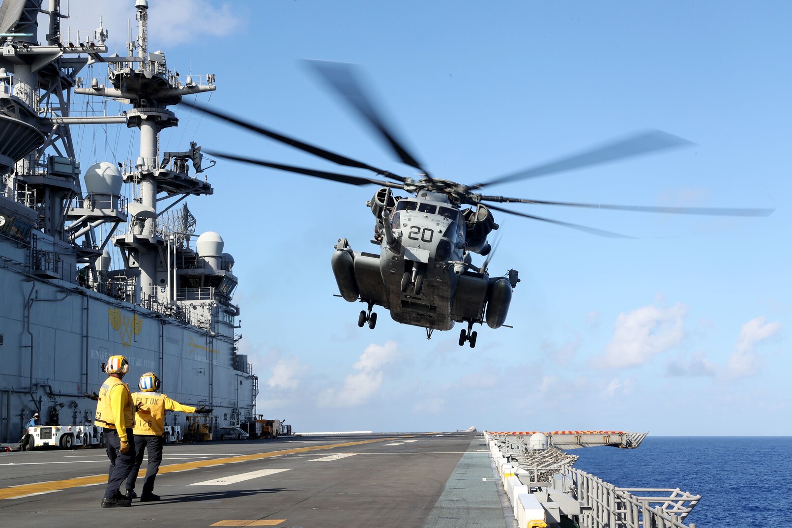 PHILIPPINE SEA (Aug. 24, 2022) A CH-53 Super Stallion helicopter assigned to Marine Medium Tiltrotor Squadron (VMM) 262 (Reinforced) takes off from amphibious assault ship USS Tripoli (LHA 7), Aug. 24, 2022. Tripoli is operating in the U.S. 7th Fleet area of operations to enhance interoperability with allies and partners and serve as a ready response force to defend peace and maintain stability in the Indo-Pacific region. (U.S. Navy photo by Mass Communication Specialist 1st Class Peter Burghart)