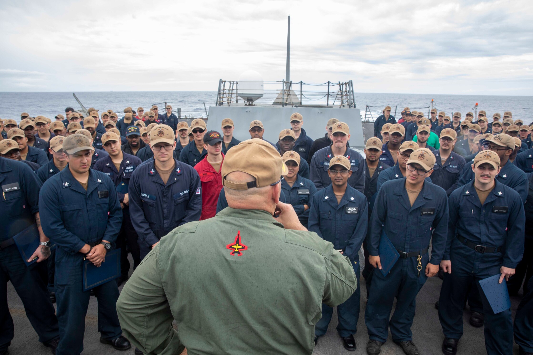 ATLANTIC OCEAN (Aug. 22, 2022) Rear Adm. Dennis Velez, commander, Carrier Strike Group (CSG) 10, George H.W. Bush CSG, speaks with the crew of the Arleigh Burke-class guided-missile destroyer USS Farragut (DDG 99), Aug. 22, 2022. Farragut is part of the George H.W. Bush Carrier Strike Group, an integrated combat weapons system that's delivers superior combat capability to deter, and if necessary, defeat America's adversaries in support of national security. (U.S. Navy Photo by Mass Communication Specialist 2nd Class Ryan Childress)