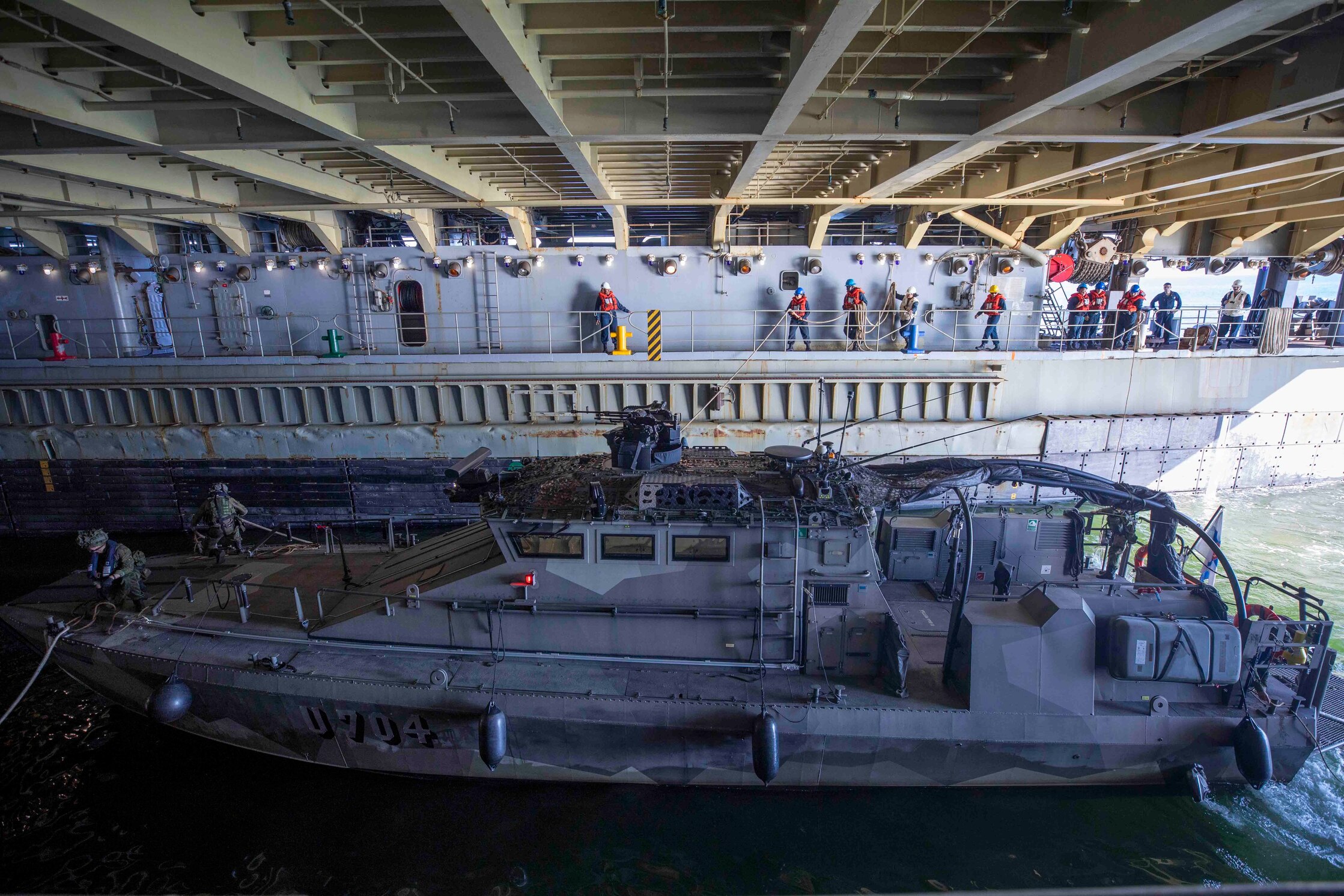 BALTIC SEA (Aug. 14, 2022) A Finnish Jehu-class military combat boat U704 enters the well deck of the Whidbey Island-class dock landing ship USS Gunston Hall (LSD 44) during a U.S. - Finland bilateral exercise in the Baltic Sea. Gunston Hall is part of the Kearsarge Amphibious Ready Group and embarked 22nd Marine Expeditionary Unit, under the command and control of Task Force 61/2, on a scheduled deployment in the U.S. Naval Forces Europe area of operations, employed by U.S. Sixth Fleet, to defend U.S. allied and partner interests. (U.S. Navy Photo by Mass Communication Specialist 3rd Class Keith Nowak)