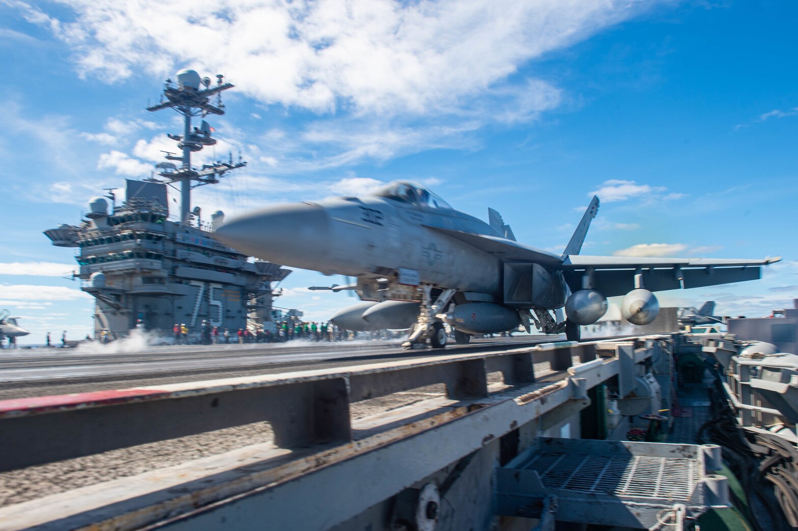 ATLANTIC OCEAN (Sept. 5, 2022) An F/A-18E Super Hornet, attached to the “Blue Blasters” of Strike Fighter Squadron (VFA) 34, launches from the flight deck of the USS Harry S. Truman (CVN 75), Sept. 5, 2022. The Harry S. Truman Carrier Strike Group is operating in the Atlantic Ocean in support of naval operations to maintain maritime stability and security in order to ensure access, deter aggression and defend U.S., allied and partner interest. (U.S. Navy photo by Mass Communication Specialist 3rd Class Jack Hoppe)