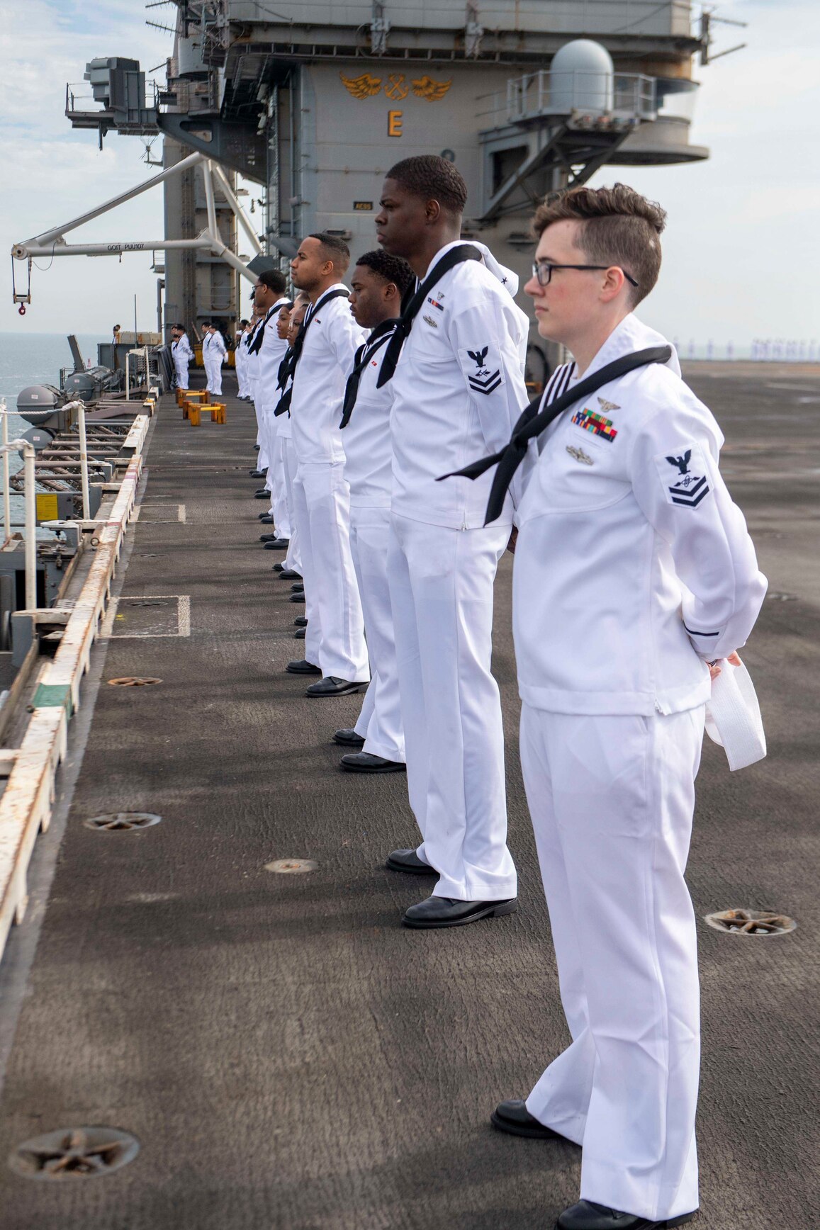CHESAPEAKE BAY (Sept. 12, 2022) Sailors man the rails on the flight deck of the Nimitz-class aircraft carrier USS Harry S. Truman (CVN 75). Harry S. Truman returns to Naval Station Norfolk after a regularly scheduled deployment in the U.S. 6th Fleet areas of operations in support of theater security cooperation efforts and to defend U.S., allied and partner interests, Sept. 12, 2022. Truman was deployed as part of the Harry S. Truman Carrier Strike Group. (Mass Communication Specialist 3rd Class Christopher Suarez)