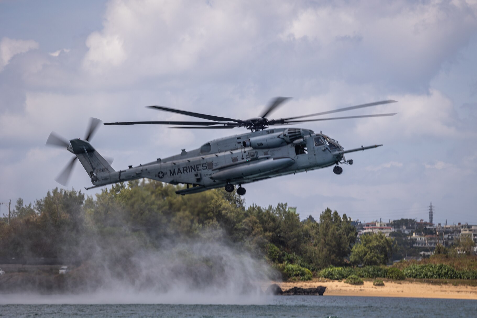 OKINAWA, Japan (Sept. 7, 2022) A U.S. Marine Corps CH-53E Super Stallion helicopter assigned to Heavy Marine Helicopter Squadron (HMH) 361 approaches the water during a helocasting masters course conducted by Expeditionary Operations Training Group (EOTG) at Kin Blue, Okinawa, Japan, Sept. 7, 2022. Helocasting is an airborne technique used by small unit special operations forces to insert into hard to reach areas via bodies of water. (U.S. Marine Corps photo by Pfc. Justin J. Marty