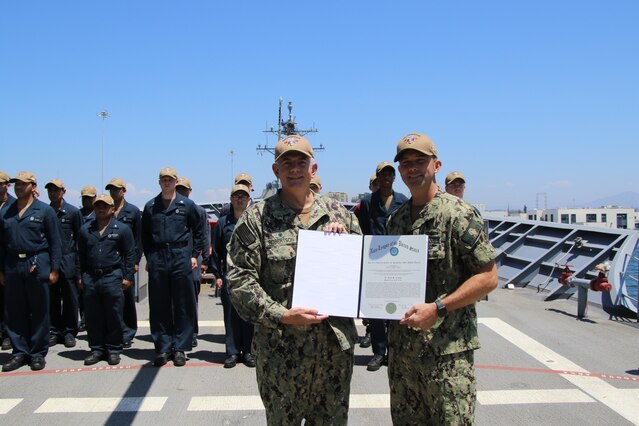 SAN DIEGO (Aug. 17, 2022) Lcdr. Kyle S. Combs, Jr., a native of Galveston, Texas, assigned to the Ticonderoga-class cruiser USS Princeton (CG 59) as the Supply officer, receives the Vice Adm. Robert F. Batchelder Award for Princeton, Aug. 17. Princeton is currently pierside in its homeport of San Diego. (U.S. Navy photo by ENS Taylor)