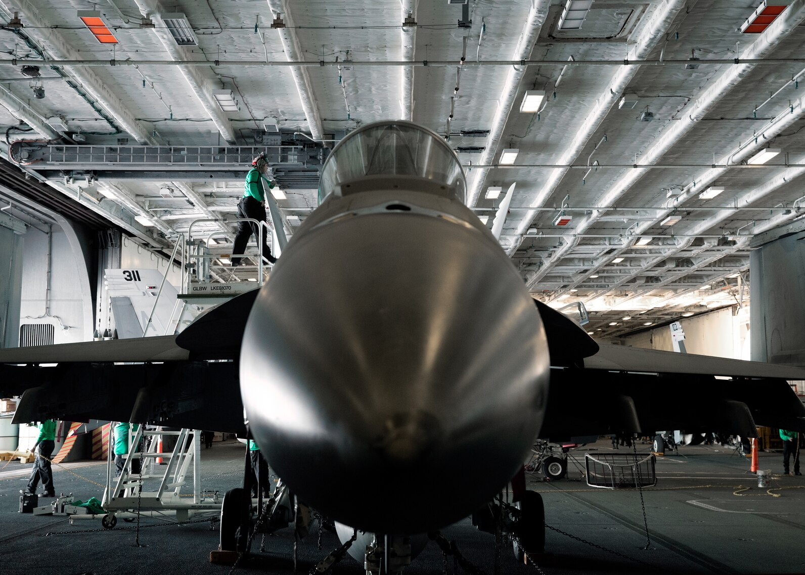 ATLANTIC OCEAN (Oct. 7, 2022) Aviation Electrician's Mate 1st Class Makayla Wilks, from Gentry, Arkansas, assigned to the "Golden Warriors" of Strike Fighter Squadron (VFA) 87, conducts routine maintenance on an F/A-18E Super Hornet in the hangar bay of the first-in-class aircraft carrier USS Gerald R. Ford (CVN 78), Oct. 7, 2022. The Gerald R. Ford Carrier Strike Group (GRFCSG) is deployed in the Atlantic Ocean, conducting training and operations alongside NATO Allies and partners to enhance integration for future operations and demonstrate the U.S. Navy's commitment to a peaceful, stable and conflict-free Atlantic region. (U.S. Navy photo by Mass Communication Specialist 2nd Class Nolan Pennington)